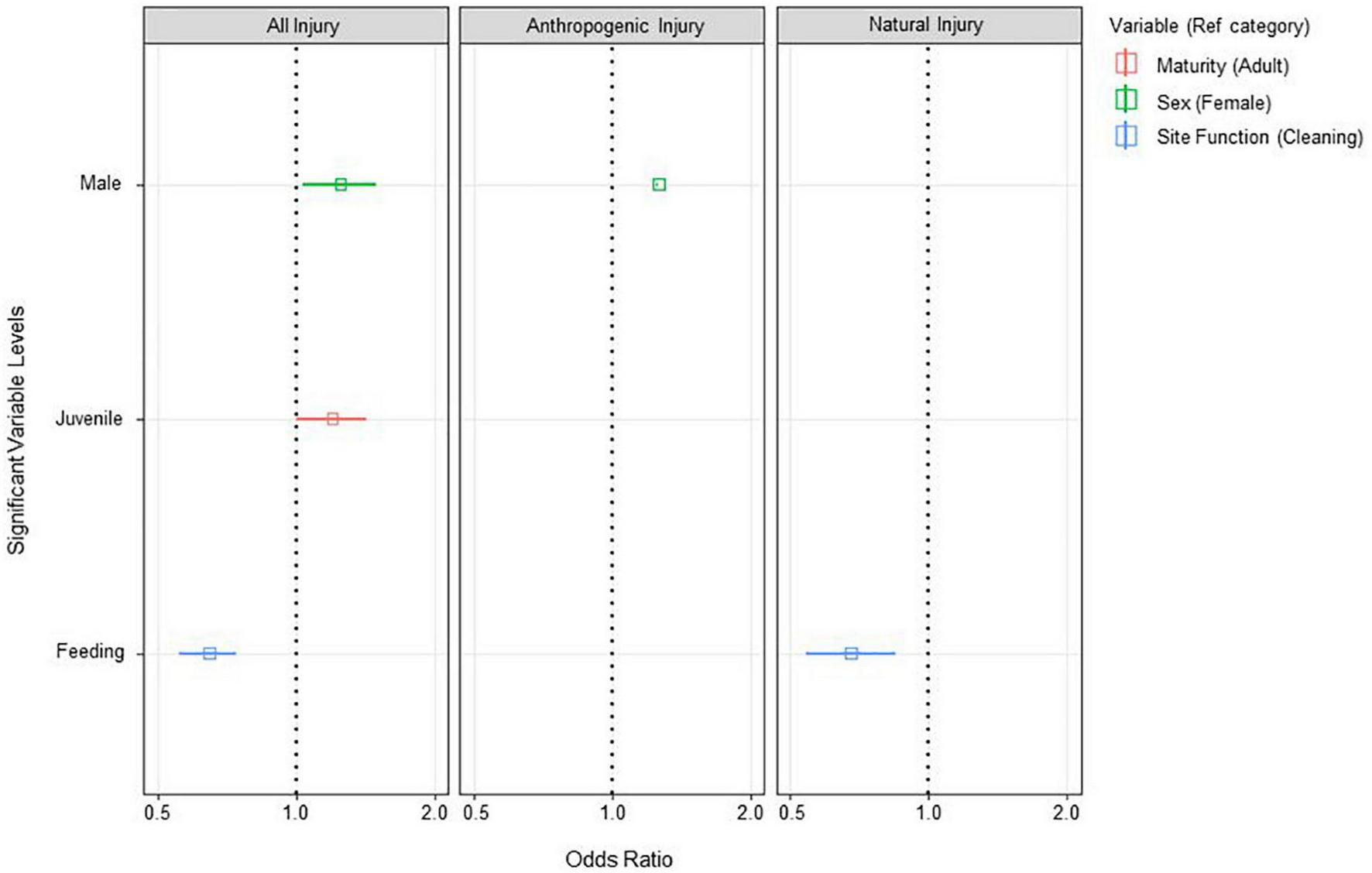 The best fit GLMM model included all three explanatory variables (sex, maturity status, and site function). The results indicate that injuries were most likely to be observed at cleaning stations; 35% more likely than at feeding areas (OR = 0.65) (Figure 5). Injuries were also more likely to be observed on juveniles (OR = 1.2), which were 20% more likely to have an injury than adults, and males were 25% (OR = 1.25) more likely to have an injury when sighted than females.