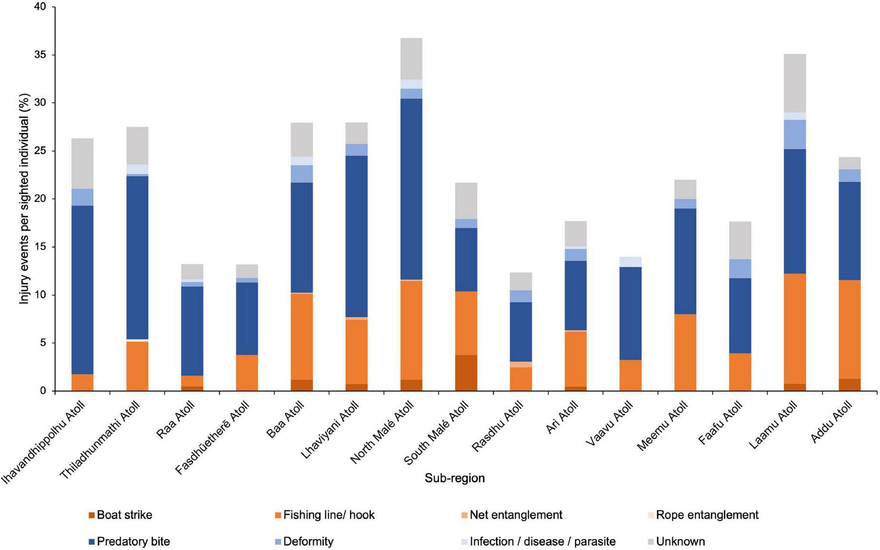 Spatial variations in M. alfredi injury events, their origin, and type were assessed by calculating the percentage of injury events per sighted individual at each atoll (total number of injury events in each atoll/total number of individual manta rays sighted in the atoll × 100). Atolls where < 50 individual manta rays were sighted during the study period were excluded from spatial analysis to reduce bias (Supplementary Table S2).