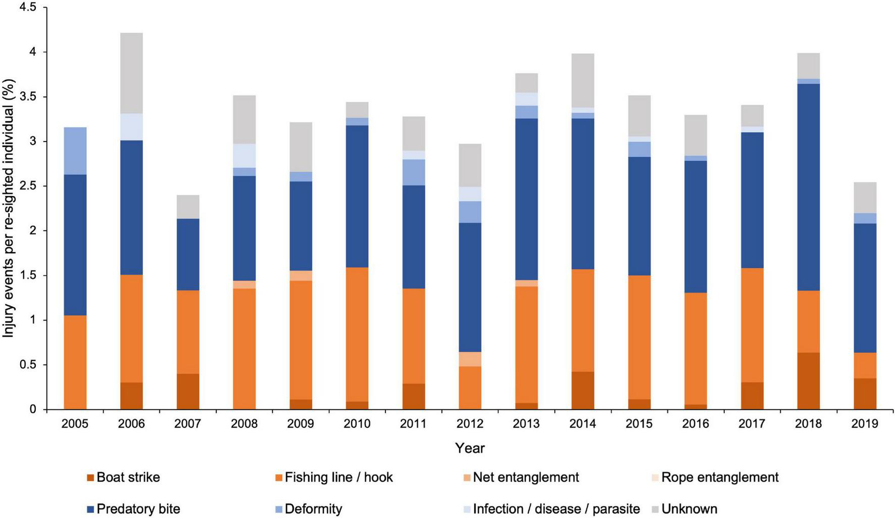 A total of 1,635 injury events were documented from 1,597 of the 72,912 (2%) sightings recorded between 1987 and 2019. Of the sightings where injury events were recorded, 489 were of adult females (31%), of which five individuals were observed to have injuries from both a natural and anthropogenic origin. Juvenile females were sighted with injuries on 364 (23%) occasions, of which three individuals were observed to have injuries of both natural and anthropogenic origins. Injury events were recorded for adult males during 625 (39%) sightings, of which nine individuals were observed to have injuries from both a natural and anthropogenic origin. Juvenile males were sighted with injuries on 119 (7%) occasions, of which one individual was observed to have injuries from both a natural and anthropogenic origin.