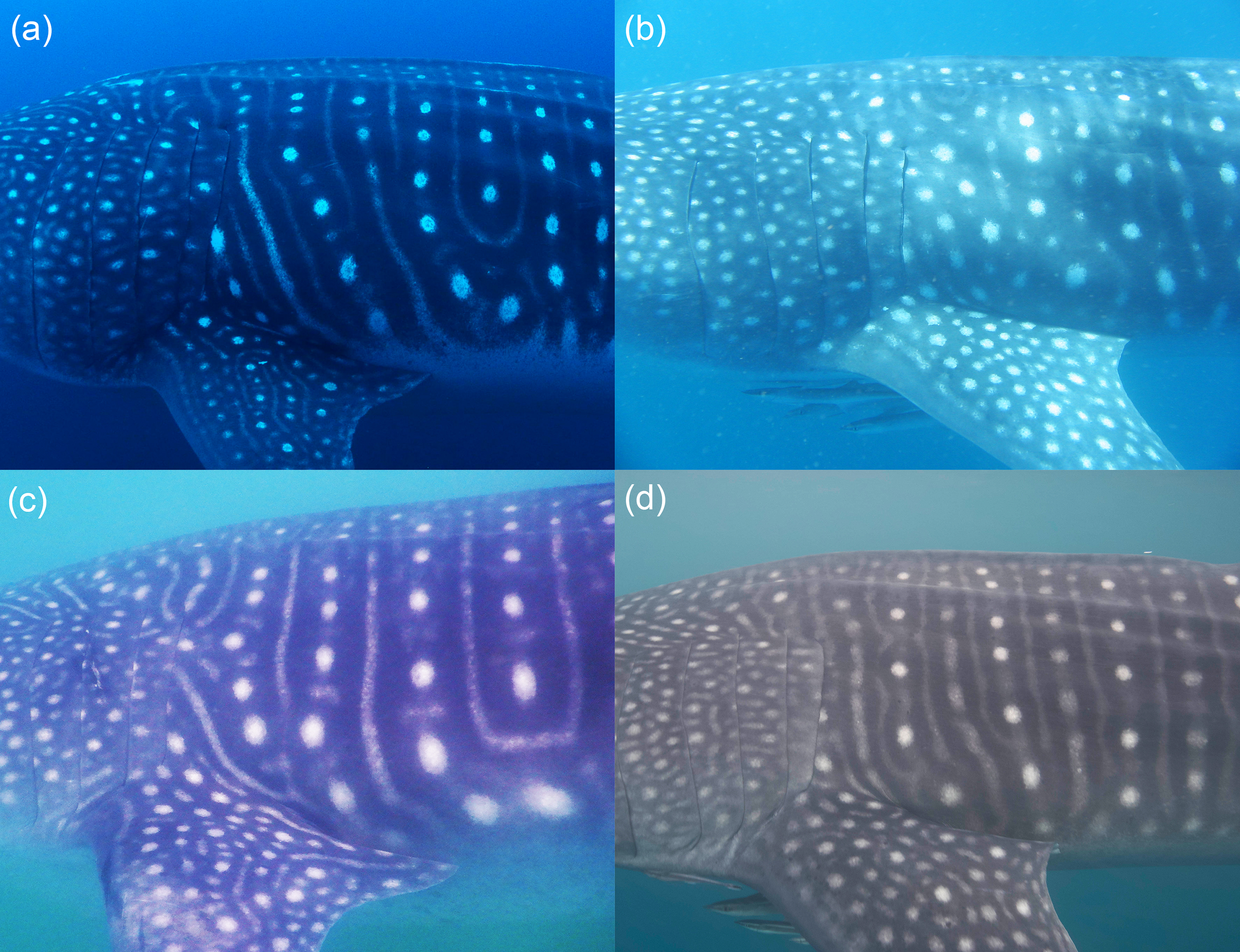 Photo-ID examples from four different study sites, (A) G-270 in the Galapagos Islands, Ecuador; (B) A-001 in Ningaloo Reef, Australia; (C) PE-163 in Cancas, Peru; and (D) P-1197 in Pintuyan, Philippines. The whale shark’s unique spot patterns make it an ideal candidate species for photo-ID studies.