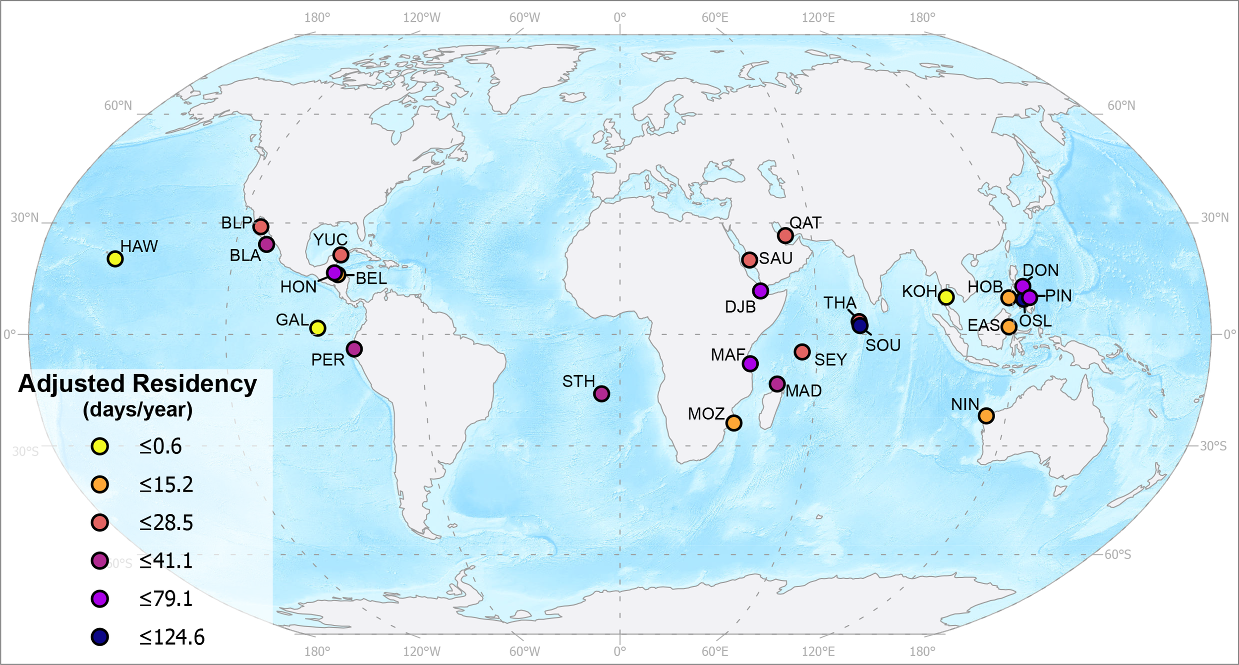 Global whale shark sites used in the present study from west to east on the map: Hawai'i, USA (HAW); Bahía de La Paz, Mexico (BLP); Bahía de Los Angeles, Mexico (BLA); the Galapagos Islands, Ecuador (GAL); Utila, Honduras (HON); Belize (BEL); Yucatan Peninsula, Mexico (YUC); Peru (PER); St. Helena, UK (STH); Tofo, Mozambique (MOZ); Mafia Island, Tanzania (MAF); Al Lith, Saudi Arabia (SAU); Gulf of Tadjoura, Djibouti (DJI); Nosy Be, Madagascar (MAD); Al Shaheen, Qatar (QAT); the Seychelles (SEY); Thaa Atoll, the Maldives (THA); South Ari Atoll, the Maldives (SOU); Koh Tao, Thailand (KOH); Ningaloo Reef, Australia (NIN); East Kalimantan, Indonesia (EAS); Honda Bay, Philippines (HOB); Oslob, Philippines (OSL); Donsol, Philippines (DON); and Pintuyan, Philippines (PIN). The shaded area represents the species range, adapted from the IUCN Red List assessment (Pierce & Norman, 2016). Map produced using ESRI ArcGIS Pro using the 1:50 m Ocean Bottom and the 1:110 m Land datasets from Natural Earth.