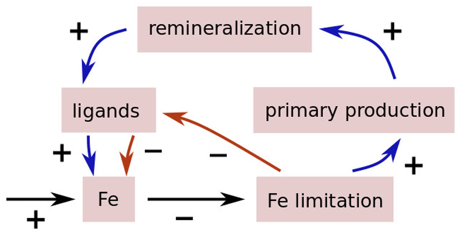 In the other scenario, as studied by Lauderdale et al. (2020), ligands are predominantly a by-product of the remineralization of particulate organic matter, such as pigments with porphyrin-like moieties that can bind iron. In that scenario, a reduction in iron supply could lead to a reduction in ligand production, possibly leading to runaway effect of decreasing iron, decreasing primary production, decreasing ligand concentrations. Again, an increase in iron supply would reverse the chain of reactions, and is shown as the blue arrows in Figure 1.