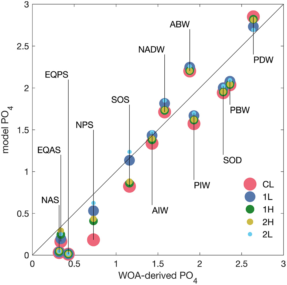 In each of these boxes, mass balances for phosphate, for the semilabile part of dissolved organic phosphorus, for iron, and—depending on scenario—for zero, one, or two organic ligands are solved. Lauderdale et al. (2020) uses nitrate rather than phosphate as the modeled macronutrient, but as long as constant stoichiommetry in organic matter is assumed and N2 fixation and denitrification are not modeled, this should not make a difference. The equations for phosphate, dissolved organic phosphorus (in the following also abbreviated as DOP), and for iron are
