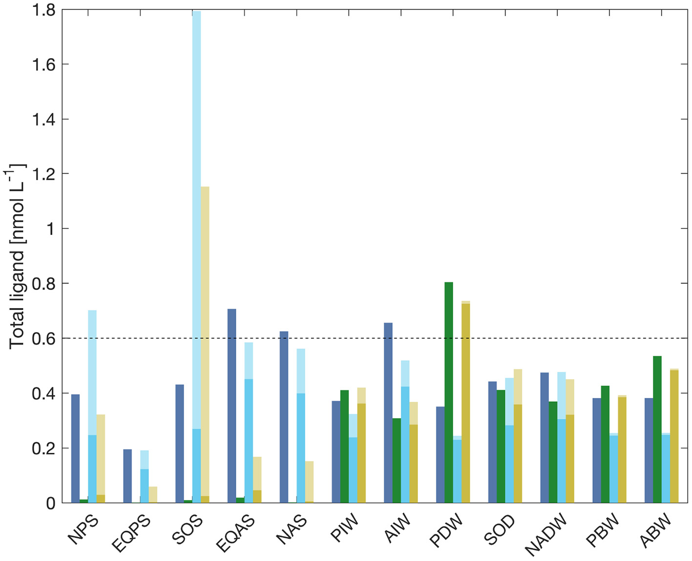Iron is an important micronutrient for photosynthetic organisms in the ocean and thus essential for regulating marine biological carbon uptake. The presence of organic ligands determines to a large extent the solubility of iron in seawater: Higher ligand concentrations mean that less iron is present in the form of Fe(III) hydroxides, which are highly insoluble (Liu and Millero, 2002; Kuma, 2003). Globally, one would expect that for a given magnitude of iron sources to the ocean, iron concentration increases with increasing average ligand concentration. This would have implications for biological productivity in the more than 30% of the surface ocean where presently iron limits phytoplankton growth. On the other hand, many organic ligands are a product or by-product of marine biological production themselves. This creates the possibility of feedbacks between biological production and the concentration of dissolved iron. Understanding the strength and direction of these feedbacks may therefore be important also for understanding how the system will react to external changes in the iron cycle, e.g., to the larger dust deposition in a glacial ocean.