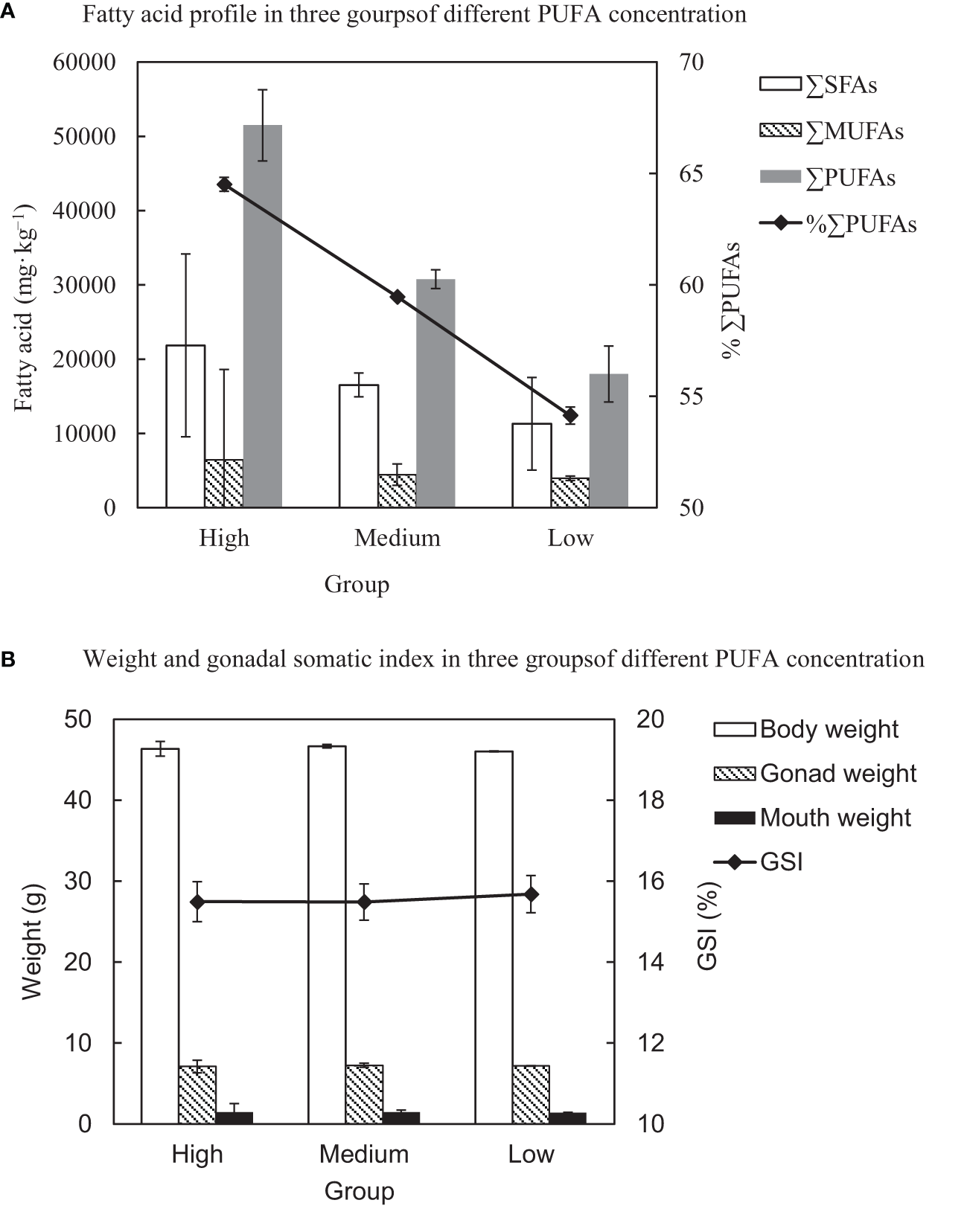 Characteristics of sea urchin Strongylocentrotus intermedius in three groups of different PUFA concentration. (A) Fatty acid profile; (B) weight and gonadal somatic index of sea urchin. The results are expressed as mean ± SEM (n= 3). SFAs, saturated fatty acids; MUFAs, monounsaturated fatty acids; PUFAs, polyunsaturated fatty acids.