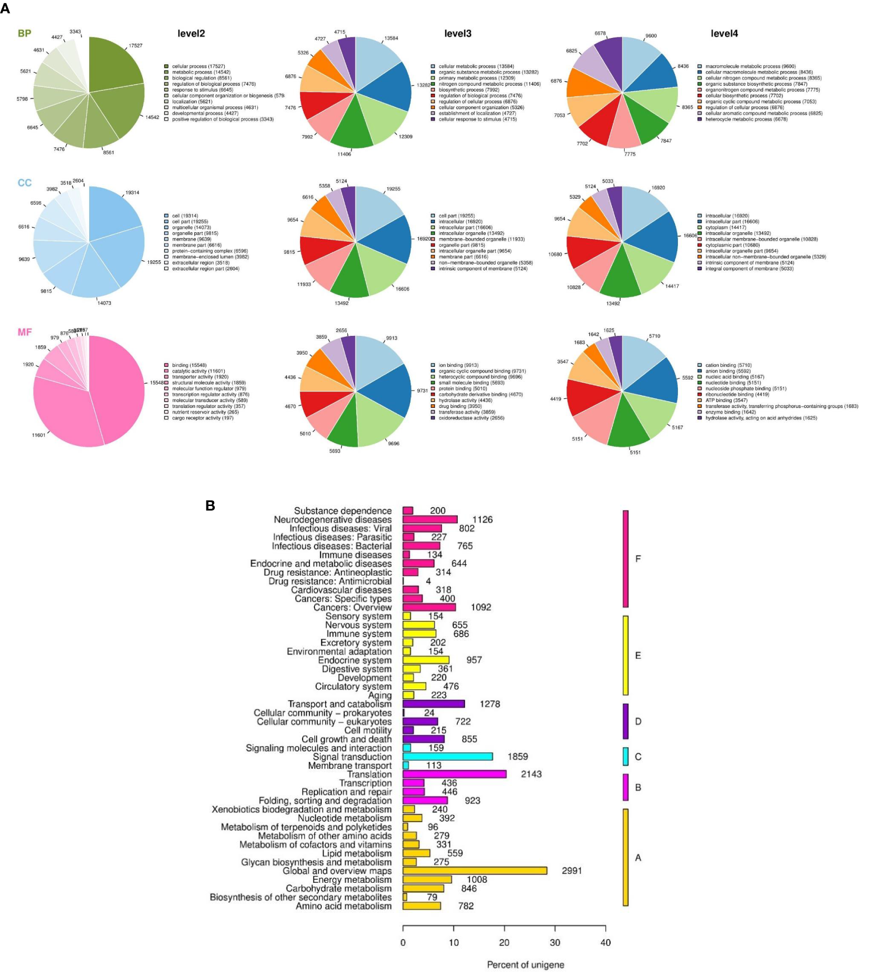 Global transcriptomic analysis of Strongylocentrotus intermedius gonads. (A) GO annotation in level 2, 3 and 4, BP, biological process; CC, cellular component; MF, molecular function. (B) Unigenes homology to KEGG, A: metabolism: B: genetic information processing; C: environmental information processing; D: cellular processes; E: organismal systems; F: human diseases.