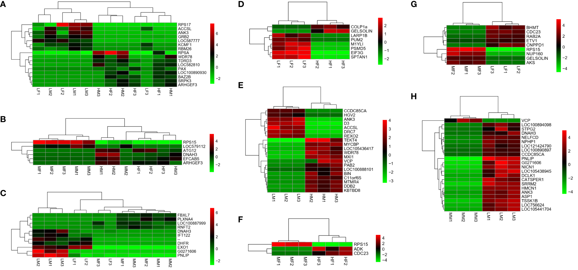 Heatmaps based on differentially expressed genes from pairwise comparisons. Different colors indicate relative expression levels. (A) H vs L; (B) H vs M; (C) M vs L; (D) HF vs LF; (E) HM vs LM; (F) HF vs MF; (G) LF vs MF; (H) LM vs MM. Sample name explanation: H”- high concentration of PUFA in both sexes of sea urchin; “M”- medium concentration of PUFA in both sexes; “L”-low concentration of PUFA in both sexes; “HF” - high concentration of PUFA in ovaries of female sea urchins; “HM” - high concentration of PUFA in testes of male sea urchins; “MF” - medium concentration of PUFA in ovaries; “MM” - medium concentration of PUFA in testes; “LF” - low concentration of PUFA in ovaries; “LM” - low concentration of PUFA in testes. The number (1, 2, 3) means three replicates.
