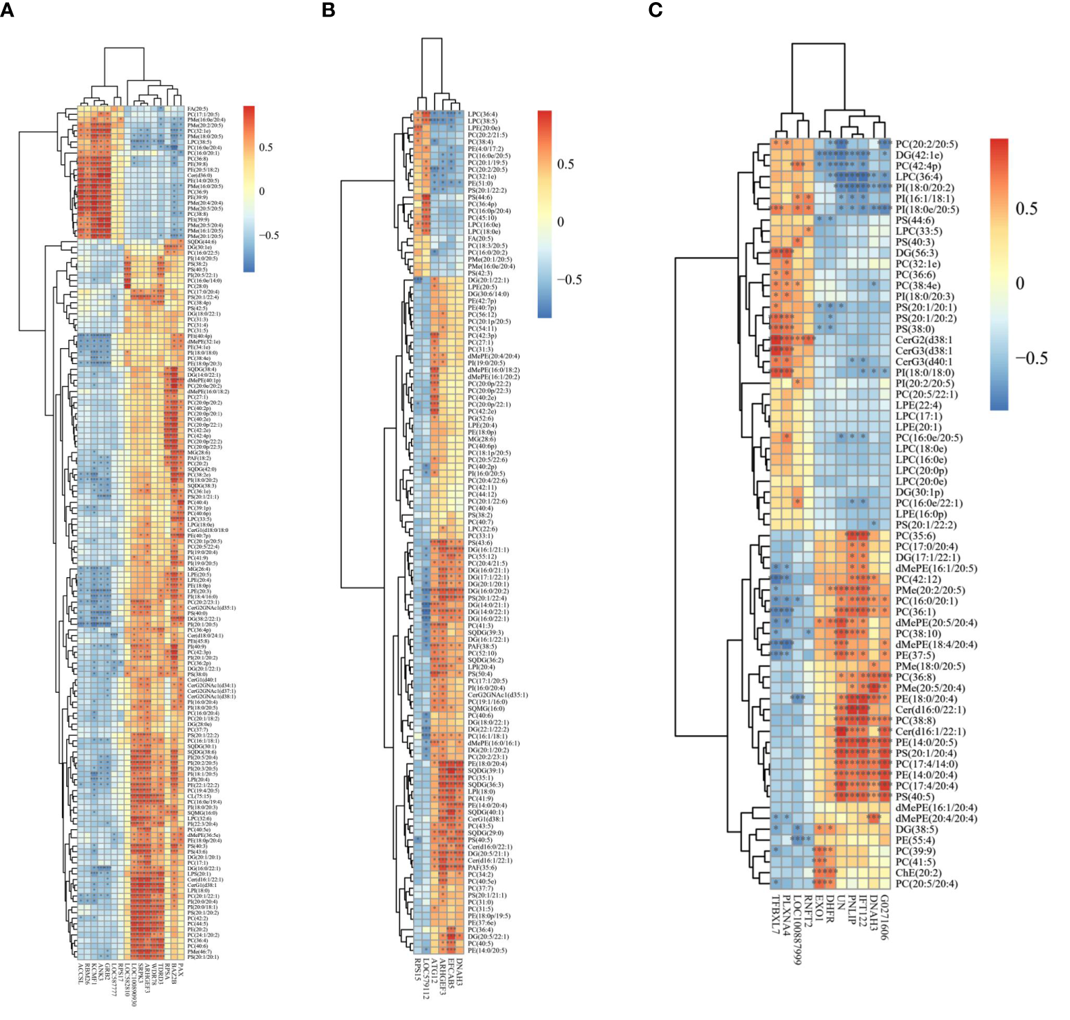 For UPLC-MS/MS (lipidomics) and RNA-seq (transcriptomic) analyses, data were converted into vectors to calculate the Spearman’s rank correlation coefficient between the significantly different lipid metabolites and differentially expressed genes (DEGs) profiles among the three groups.