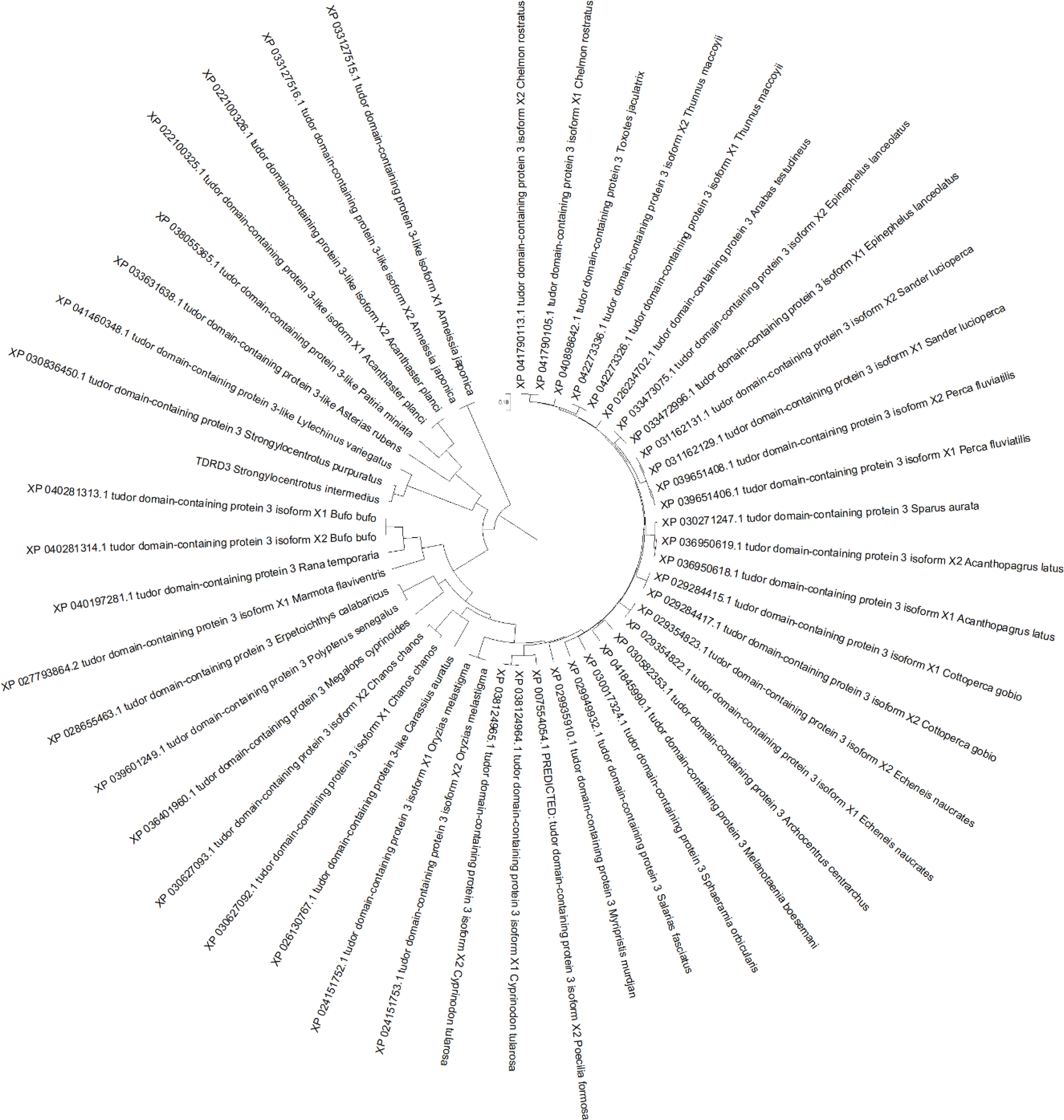 To investigate the mechanism of PUFA metabolism in sea urchin gonads, integrated analysis was performed on the lipidomics and transcriptomic levels. The number of DEGs and significantly changed lipid molecules among the different sexes and different PUFA abundance groups are shown in Table 4. There were 16 DEGs and 266 lipids in H vs L comparation, 6 DEGs and 160 lipids in H vs M comparation, 11 DEGs and 129 lipids in M vs L comparation of both sexes of sea urchins, respectively. On the distinction of sea urchin sexes, there were 228 DEGs and 123 lipids, 346 DEGs and 322 lipids in high and low concentration PUFA group, respectively. Then these DEGs and lipids were used to carry out the correlation analysis, and the heat maps performed are shown in Figure 5. Interestingly, in the correlation analysis, we found that the unigene (ID: TRINITY_DN1066_c0_g1) was up-regulated in the high concentration PUFA group, and this gene was significantly related to EPA (C20:5) (p<0.05) (Figure 5A). We used ORF finder to search for the open reading frame of the sequence and identify it in the NCBI database. The putative amino acid sequence had 93.67% identify with the tudor domain-containing protein 3 (TDRD3) of Strongylocentrotus purpuratus, 79.39% with that of Lytechinus variegatus, and 41.24% with that of Patiria miniata, and the phylogenetic tree is shown in Figure 6.