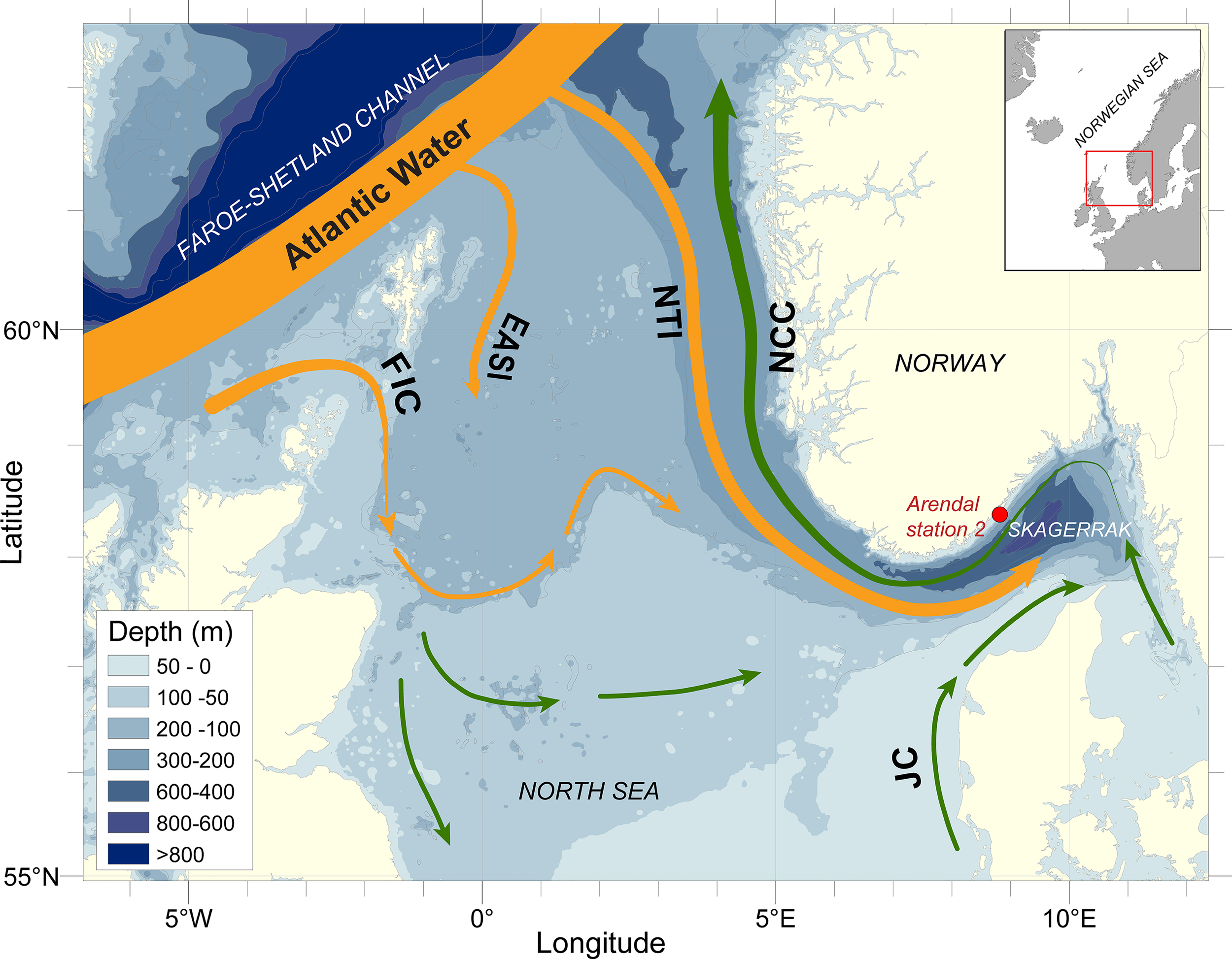 North Sea and Skagerrak with main currents and location of Arendal Station 2 monitoring site. NTI: Norwegian Trench Atlantic Inflow; NCC, Norwegian Coastal Current; ESAI, East Shetland Atlantic Inflow; FIC, Fair Isle Current; JC, Jutland Current. Inset map shows the location of the Skagerrak area relative to adjacent seas.