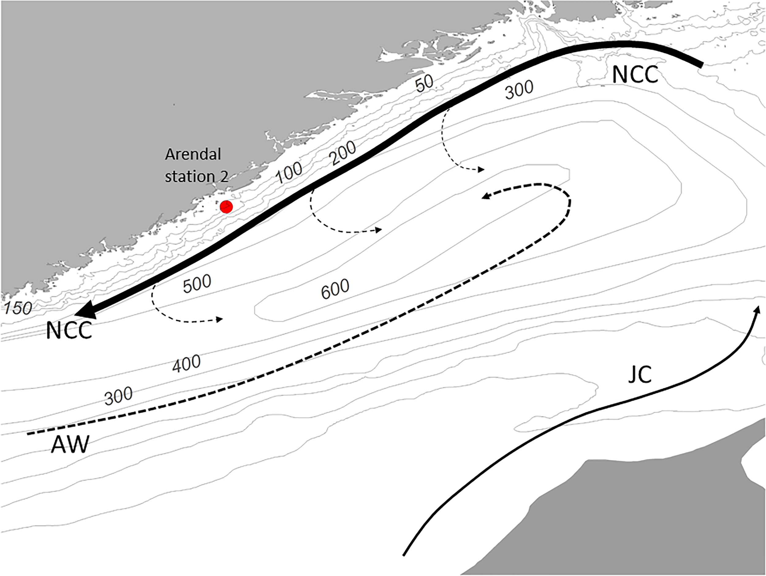 Local bathymetry and prevailing circulation systems in Skagerrak. NCC, Norwegian Coastal Current; AW, Atlantic water; JC, Jutland Current.