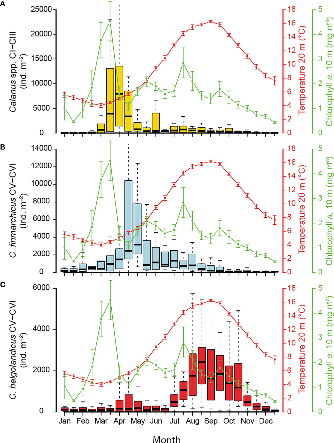 Seasonal pattern in abundances at 0-50 m depth of (A)Calanus spp. CI-CIII (B), C. finmarchicus CV-VI and (C)C. helgolandicus CV-VI. Lower and upper edges of boxes represent the 25 and 75 percentiles, and the horizontal lines the medians. Extreme observations outside the range of the whiskers are not shown. Seasonal variation in temperature (20 m, mean and standard error, SE) and Chl-a (10 m, mean and SE) on right axis. Data on temperature and Chl-a were obtained from the Norwegian Coastal Monitoring Programme.