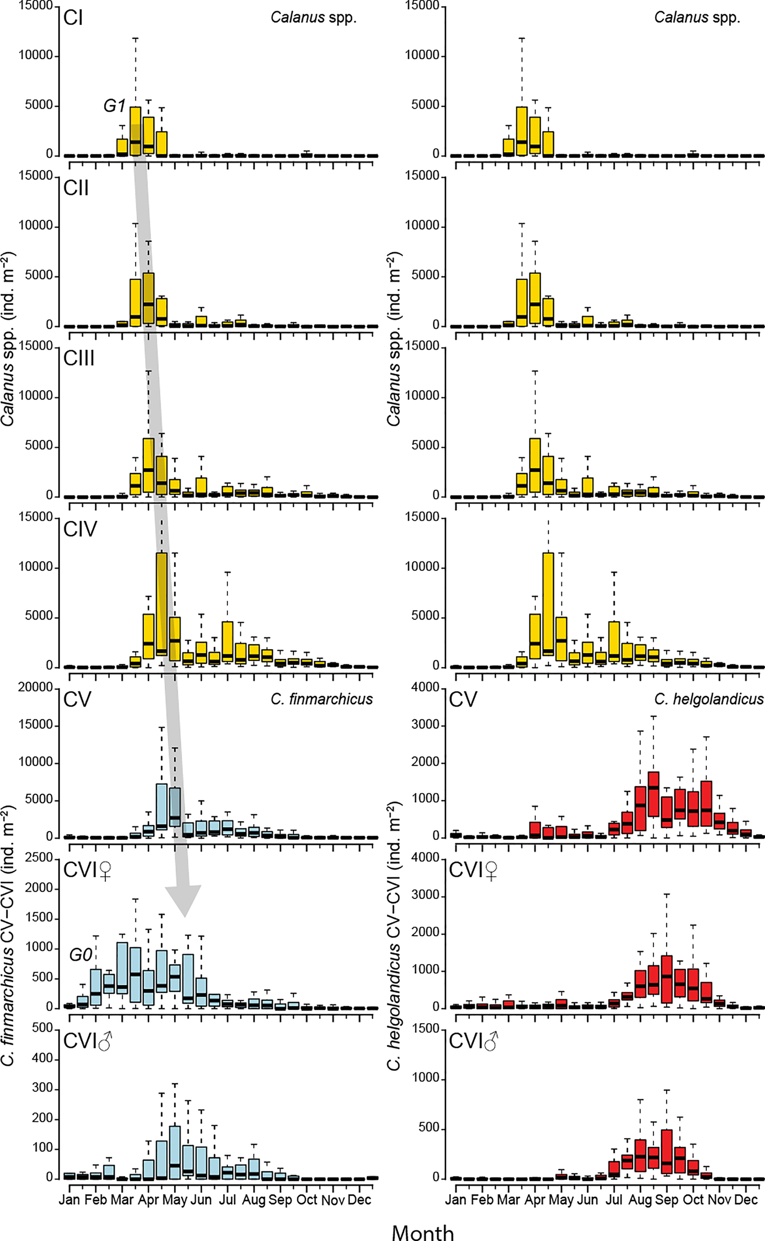 Boxplots of abundances of Calanus spp CI-IV (yellow), C. finmarchicus CV-VI (blue) and C. helgolandicus CV-VI (red) versus two-week period. Lower and upper edges of boxes represent the 25 and 75 percentiles, and the horizontal lines the medians. Extreme observations outside the range of the whiskers are not shown. Copepodite stages CI-IV were not identified to species but are included in both left- and right-hand panels to aid elucidation of stage and generation cycles for each species. The shadowed arrow indicates our suggested first new generation of C. finmarchicus of the year, G1; G0, overwintering population.