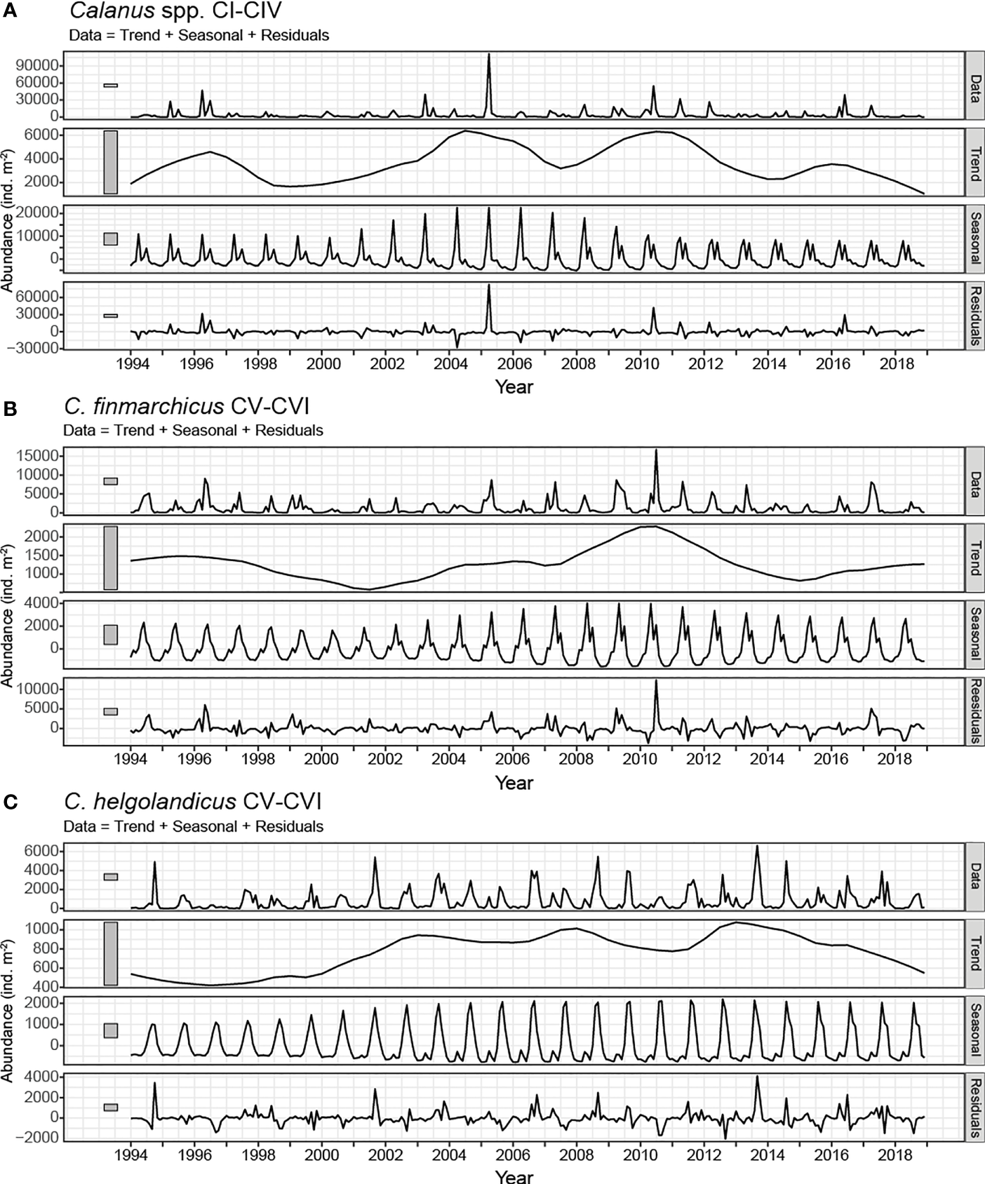 Seasonal and Trend time series decomposition using Loess with a 5-year trend window and 12-month seasonal window for the abundance of (A)Calanus spp. CI-IV, (B)C. finmarchicus CV-VI and (C)C. helgolandicus CV-VI. For each of the three time series shown (A–C), five sub-panels are presented. Original data are presented in the uppermost panels as monthly average abundances (Data). The Loess trend-cycle component (Trend) captures the interannual variability. The seasonal component (Season) shows the within-year variability throughout time. In the lowermost panel for each time series, the component representing the remainder is shown (Residuals), which is what is left after subtraction of the seasonal and the trend/cycle components from the original monthly abundances. Grey bars to the left of each panel show the relative scales of contribution of each component.