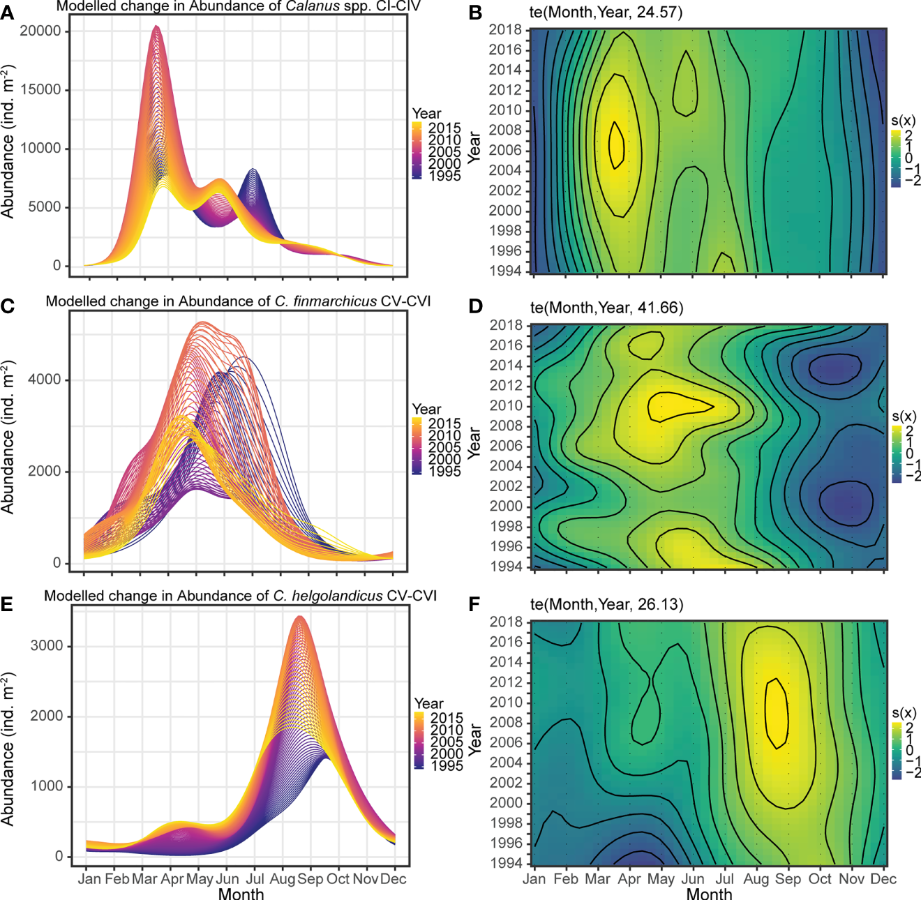 A strong annual peak in C. helgolandicus CV-VI in autumn (August-September) was predicted by the model (deviance explained = 63.4%), with increasing abundances over the years (Figures 6E, F). Concurrent with the increasing abundances, the model indicates an earlier timing of the autumn peak over time, suggesting an advancement from mid-September to mid-August. Moreover, the model suggests that the seasonality of C. helgolandicus has changed from a unimodal to a bimodal pattern. In the early years of the time series, one single annual peak of C. helgolandicus was found, whereas after around 2002 an additional small peak appeared, occurring in mid-April. This is also evident from the time-series decomposition model shown in Figure 5C.