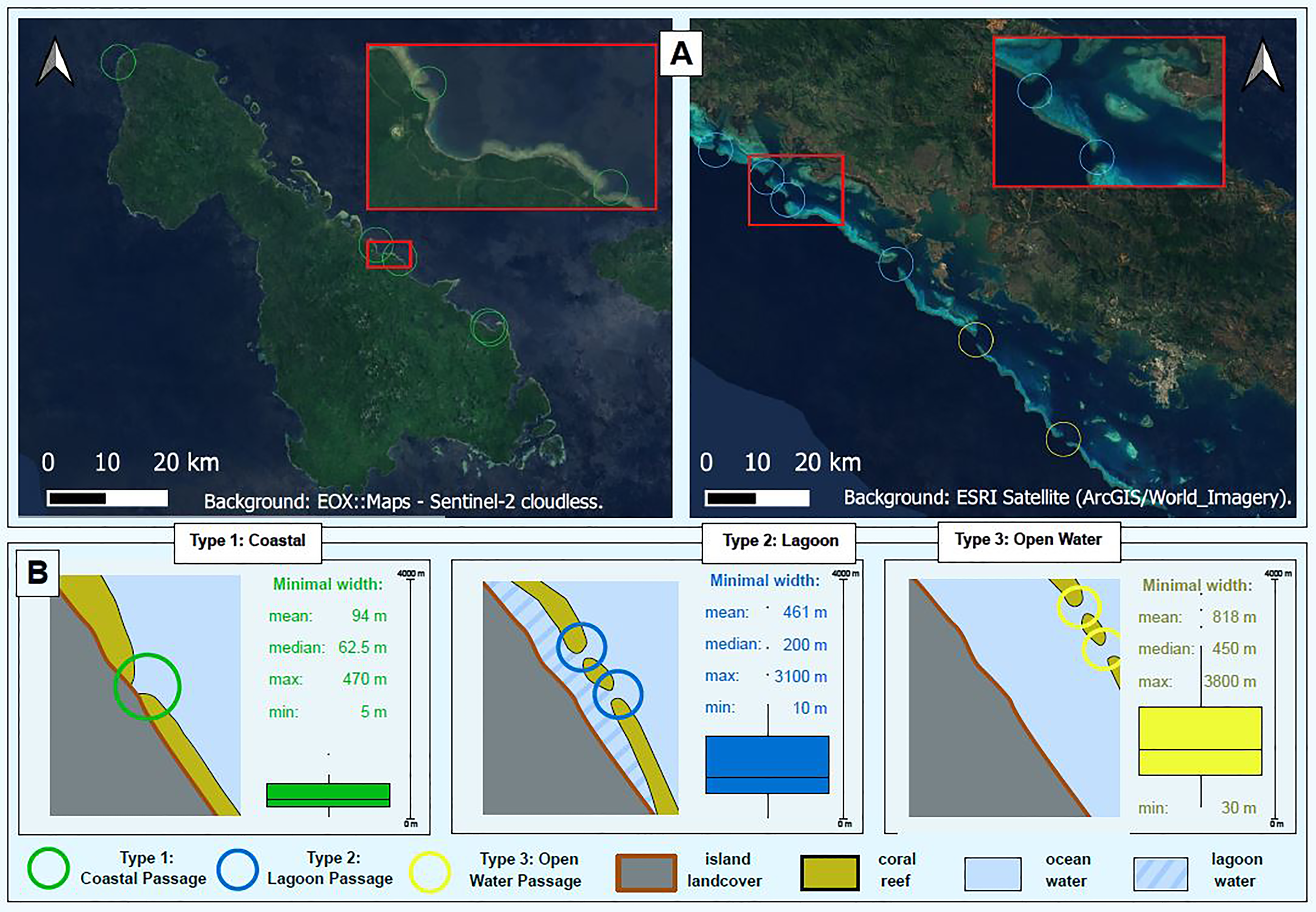 (A) Satellite images of examples of reef passages from the study sites; Type 1 around Malekula on the left, and Types 2 and 3 around Grande Terre on the right; the circles represent the location of the reef passage, and the color of the circles the proposed reef passage type. (B) Conceptual image of the three types of reef passages proposed in this paper with boxplot images of minimal width values for each type; green=Type 1 ‘Coast’, blue=Type 2 Lagoon’, yellow= Type 3 ‘Open Water’ (NC = New Caledonia, VU = Vanuatu).