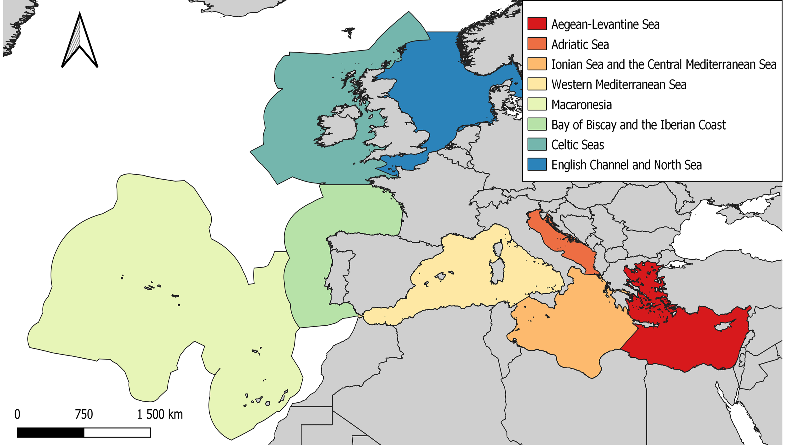 Map of MSFD subregions frequented by marine turtles. Shapefiles for this map were downloaded from the European Environment Agency website (www.eea.europa.eu).
