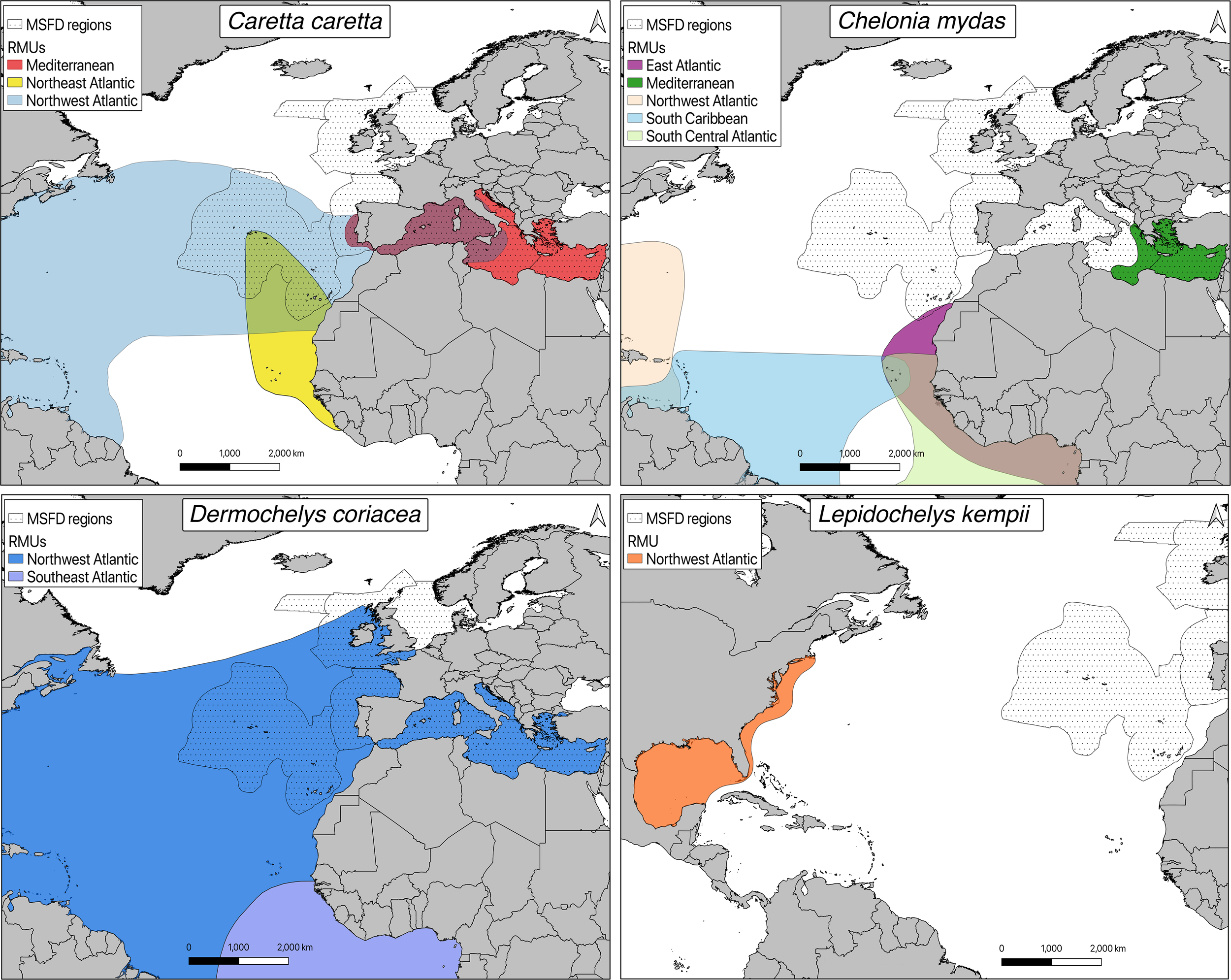 Maps representing the overlap between Regional Management Units (RMUs) for marine turtle species proposed for MSFD assessment and MSFD regions. Modified from Wallace et al., 2010a. RMU data were downloaded from the OBIS-SEAMAP website (http://seamap.env.duke.edu/swot; Kot et al., 2021).
