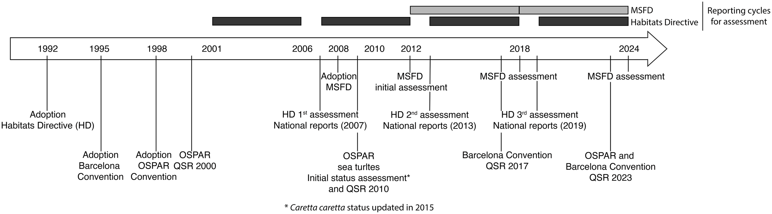 Timeline of reporting cycles and assessments under European Directives (Marine Strategy Framework Directive - MSFD, Habitats Directive - HD) and Regional Sea Conventions (OSPAR and Barcelona Convention). QSR refers to quality status reports.
