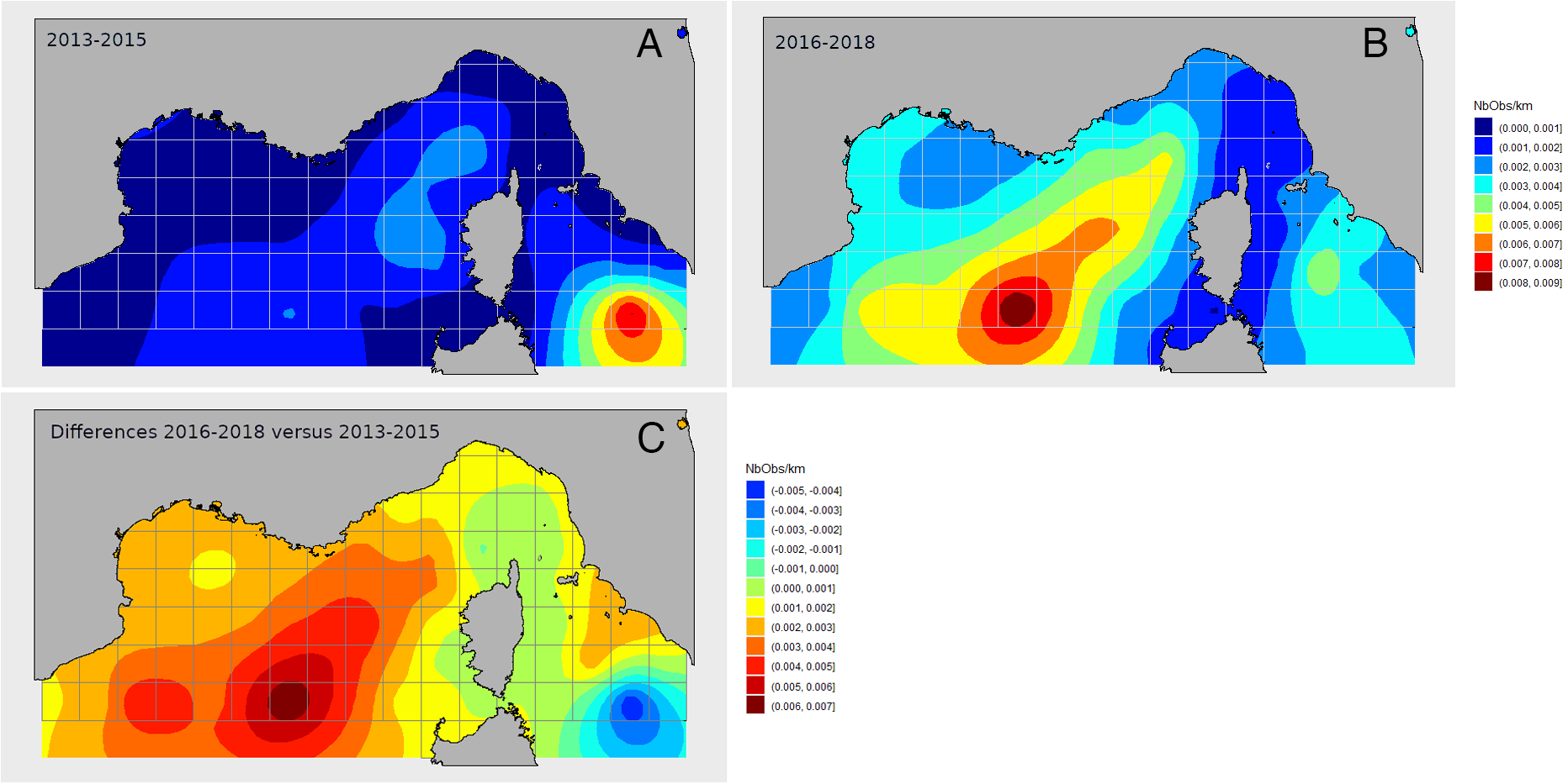 As detailed in section 3.2.2.1, the assessment of criterion D1C2 should be based on trends in population abundances both at sea and nesting sites, estimated considering different analytical methods (observation-based and modelling approaches; Table 3). Due to high interannual variability in abundance estimates (Hays, 2000; Solow et al., 2002), it has been suggested that long time series of at least 10 years of data are optimal to detect trends in population abundance (Mazaris et al., 2017; Piacenza et al., 2019). For this reason, the longest time series available should be used for the assessment (Table 3). While such long time series are available for nesting sites, observation effort at sea has usually been less constant, limiting the length and number of time series that can be used for assessment. Therefore, until longer time series become available, trends in abundance at sea should be characterized over the 6-year MSFD reporting period (Table 3).
