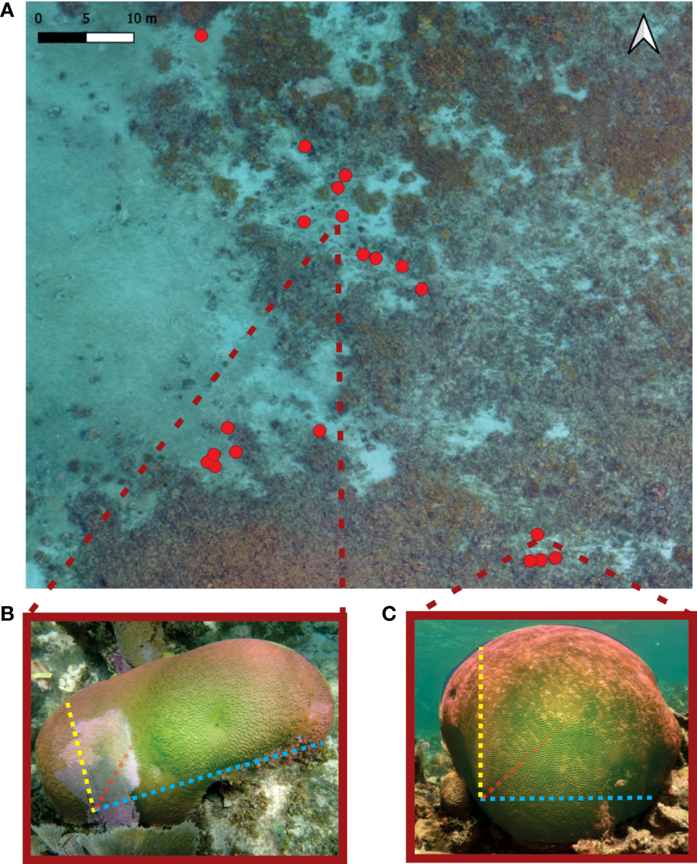 (A) Location of all the surveyed colonies of Pseudodiploria strigosa in Limones reef. Ratio between size metrics (length, width and height) indicates a coral morphology gradient between an (B) elongated and vertically compressed and (C) spherical colonies.