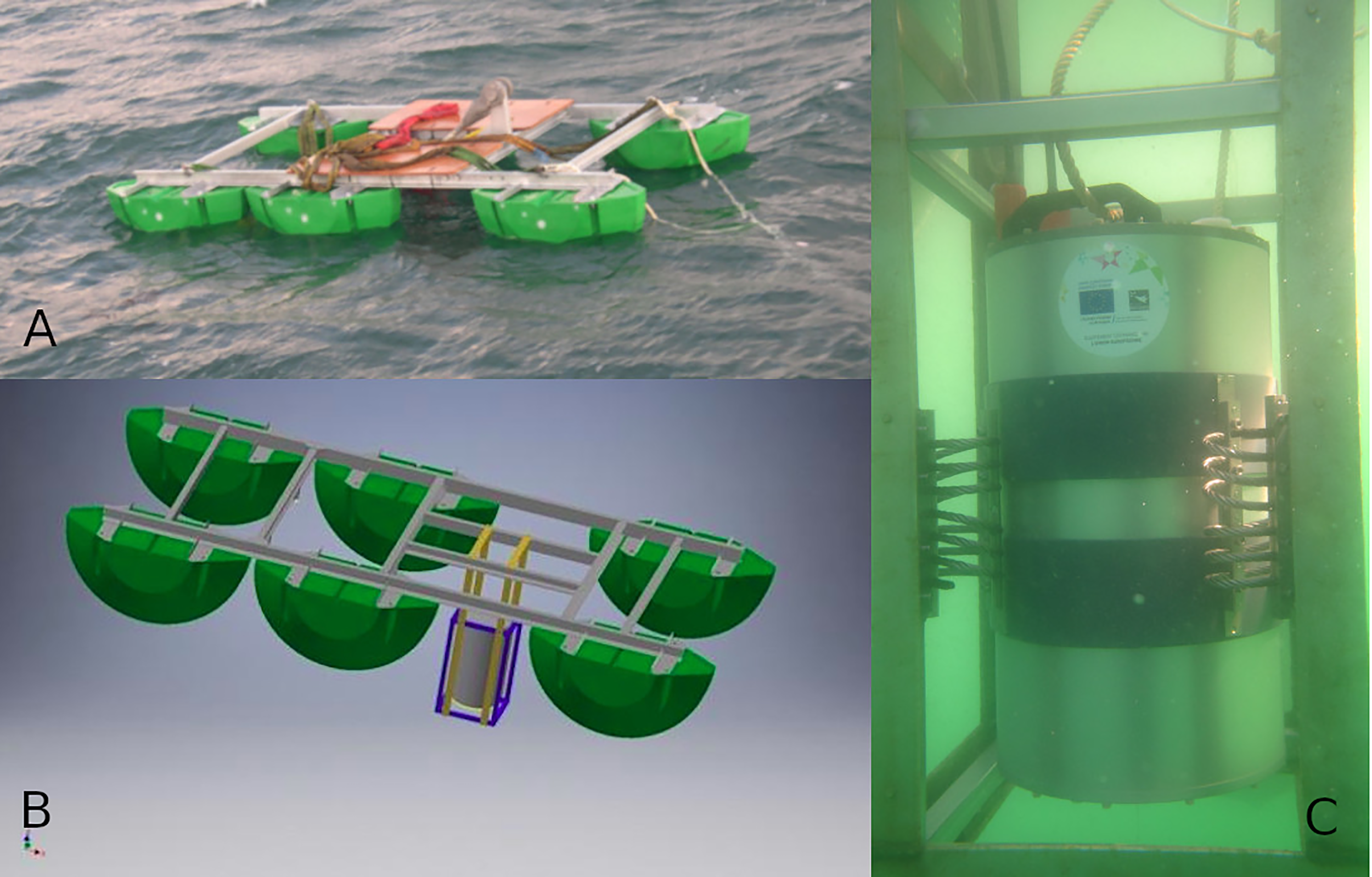 Picture of the deployment of the PRIMROSE mooring platform at Anse du Roz in the Daoulas estuary (A) and scheme (B) showing details of the floating structure frame designed for carrying the autonomous flow cytometer, IFC (C), its associated tools (batteries, etc) and other additional sensors.