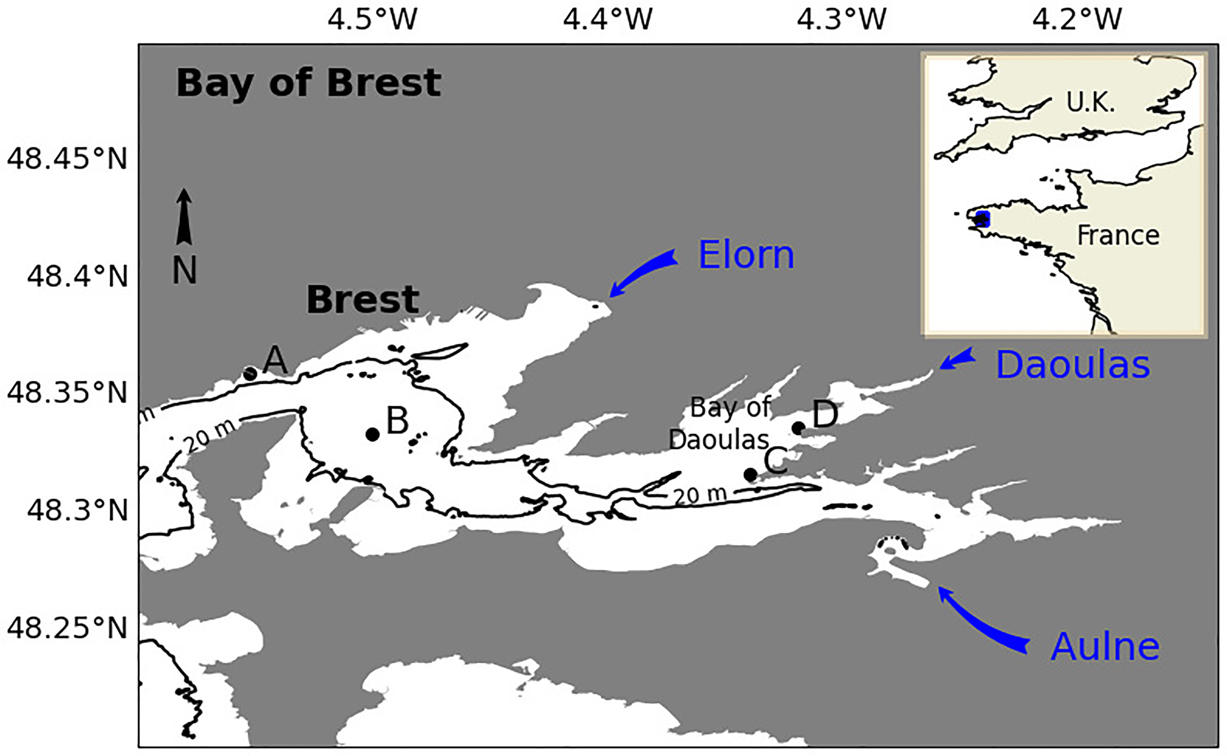 Positions of the monitoring stations in the Bay of Brest: (Station A): Ste Anne du Portzic station from SOMLIT program (Observatory in the coastal environment, http://www.somlit.fr); (Station B): Lanveoc from REPHY national program; (Station C): PRIMROSE IFC mooring at Anse du Roz in the Daoulas estuary; (Station D): Alex Breizh mooring and sampling site at Pointe du Château in the Daoulas estuary.