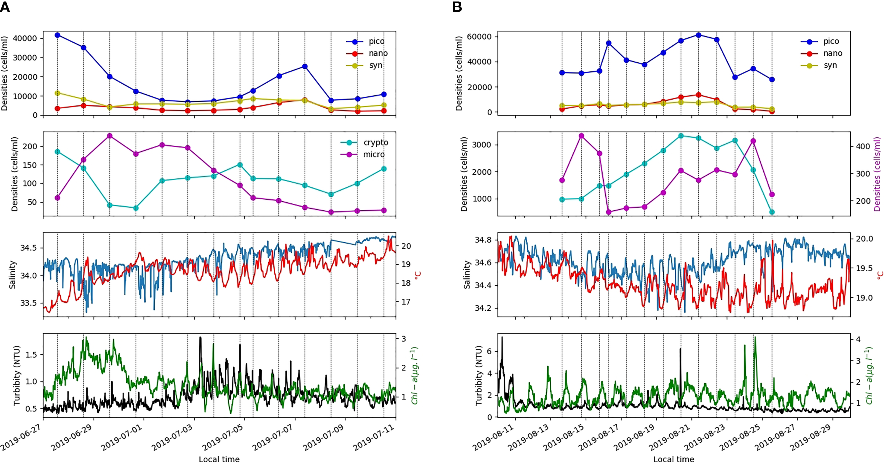 Time series of variables obtained from the IFC and other sensors on the autonomous mooring in the Daoulas estuary (station C) from 28th June to 10th July 2019 (A) and from 13th August to 25th August 2019 (B). Abundances of five regular clusters (Synechococcus, Picoeukaryotes, Nanophytoplankton, Microphytoplankton and Cryptophyceae) obtained from the IFC are plotted. IFC sampling was done at high water during the day (dotted vertical lines).