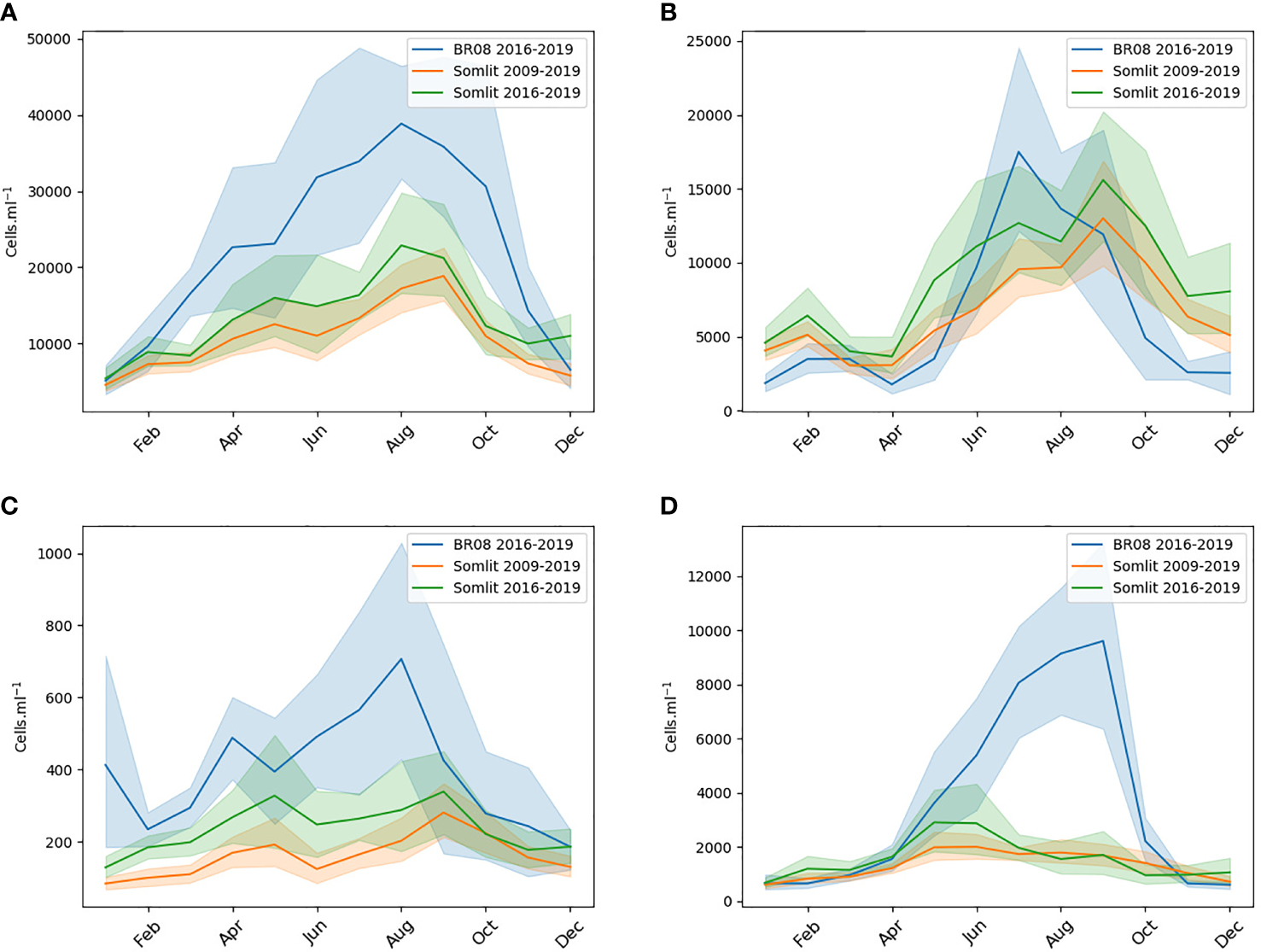 Seasonal patterns of monthly average and standard deviation) observed by the IFC in the Daoulas Estuary (station D, Figure 2, blue line) during 2016-2019 for the Picoeukaryotes, Synechococcus, Cryptophyceae and Nanophytoplankton clusters (A–D). The seasonal pattern at the entrance of the Bay was estimated from the SOMLIT-Brest station (station A) for the same and a longer period (green and red line respectively).
