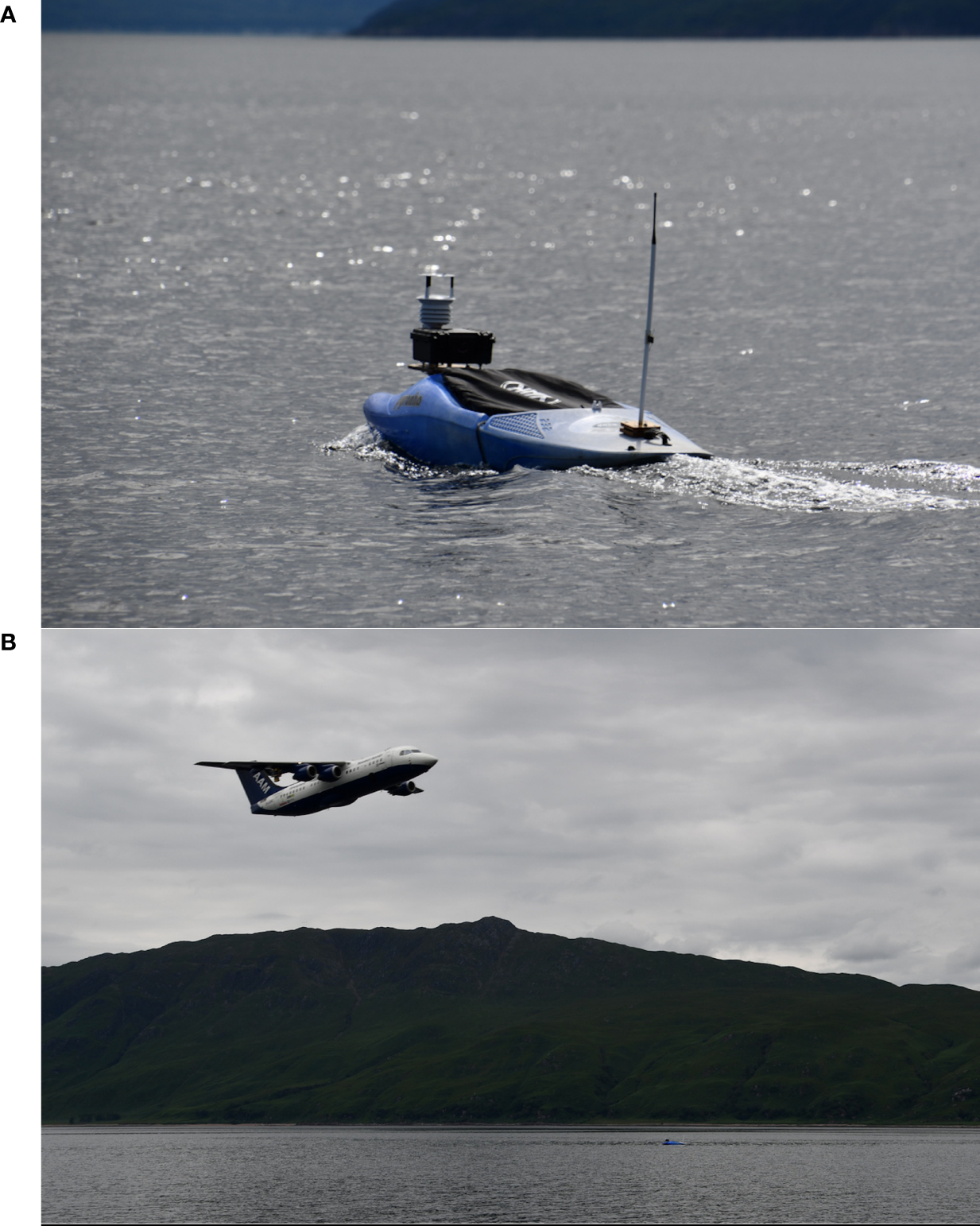 ImpYak ASV in loiter mode on Loch Linnhe in north east Scotland on 9th July 2021 (A), whilst working in conjunction with the FAAM aircraft (Facility for Airborne Atmospheric Measurements, https://www.faam.ac.uk) (B).