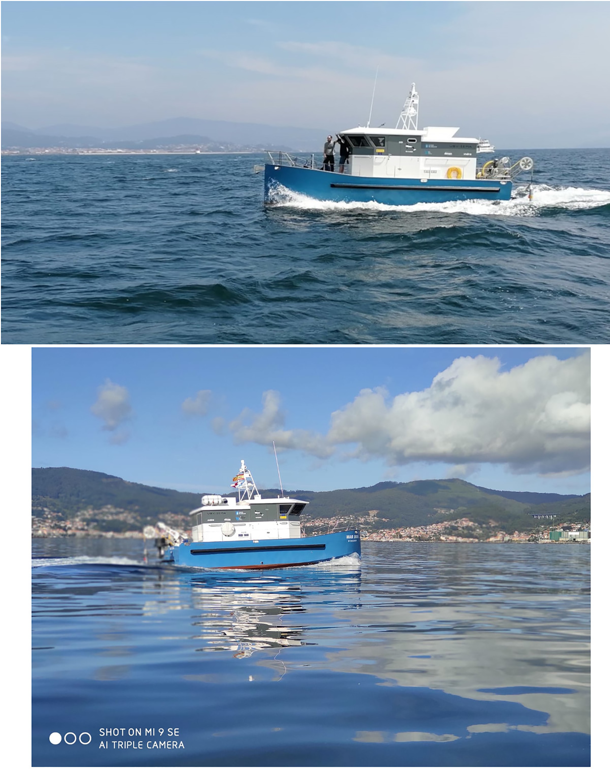In summer 2020, the consortium of companies that won the public procurement tender presented the USV-Mar II prototype5 (Figure 11). The USV-Mar II prototype is an Environmental Surveillance vessel, 10.5 m in length, made of naval steel with a reinforced fibreglass superstructure. It has a double pilot system, with operations possible from the boat or remotely following a predefined route autonomously. On board, it carries a robotic system with instruments to collect samples from water columns at different depths in predefined geographical points and has a system for data transmission to an operation room in land. The autonomy is more than 300 nautical miles. The operation of the prototype was tested in unmanned and manned mode in autumn 2020-winter 2021 and included taking water samples for nutrient analysis and phytoplankton identification and deploying the multiparametric sonde for oceanographic variables used in the weekly Galician HAB monitoring (Conductivity-Temperature-Depth (CTD) profiler equipped with a WETStar fluorescence sensor) in the Galician rias de Pontevedra and Vigo. The sampling system was found to be able to collect, classify, label, store and automatically conserve all samples.