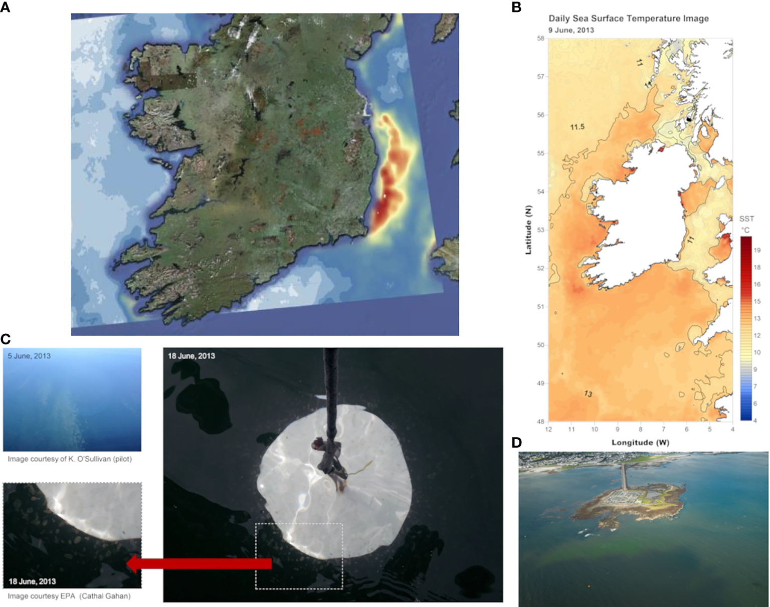 (A) Satellite Chlorophyll image showing the extend of an exceptional Phaeocystis bloom in the Irish Sea, June 2013, (B) Satellite derived sea surface temperature data (CMEMS ODYSSEA SST data product) shows colder water evident at the bloom position (C) photographic images of dense Phaeocystis colonies in surface waters off the north Dublin Irish coastline on 18th June, 2013. The large globular Phaeocystis colonies are visible to the human eye in the water against the Secchi disk at the surface; aerial photograph of the bloom on 5th June taken by a pilot ~ 18.5 Km off the Irish east coast. (D) Bloom of cyanobacteria in Galway Bay, west coast of Ireland, in 2017 taken from a Coastguard Search and Rescue Helicopter revealing the extent of the bloom within the bay.