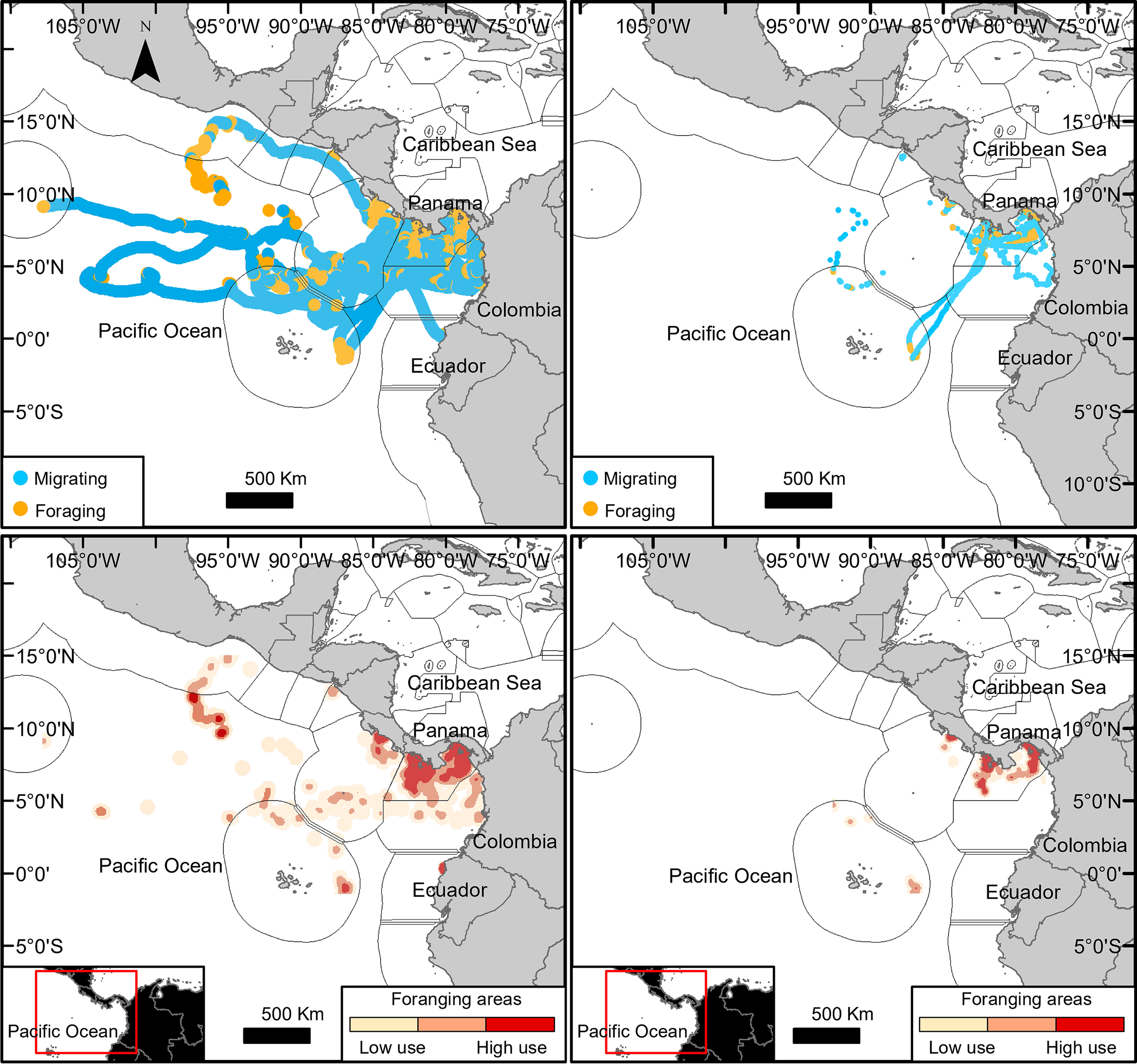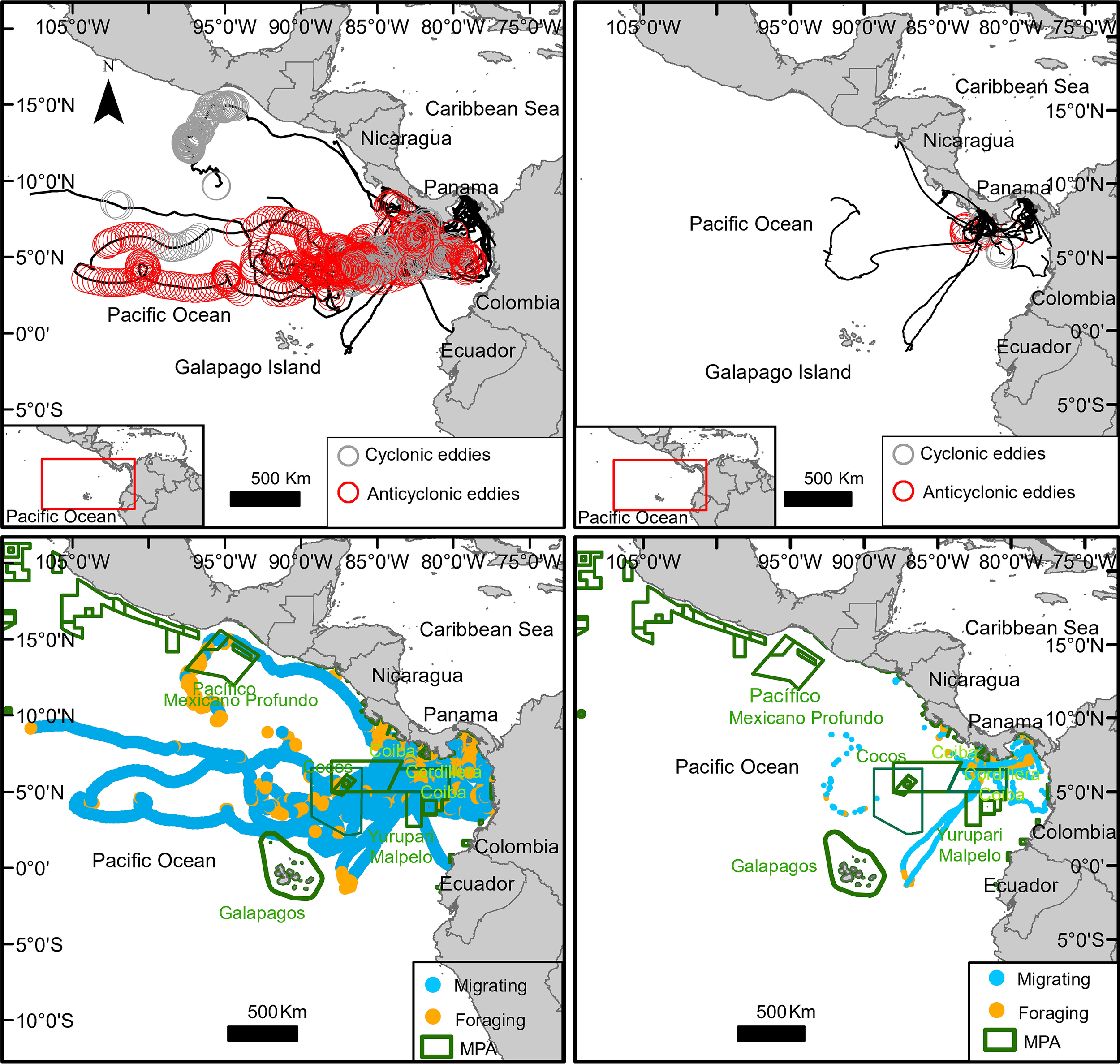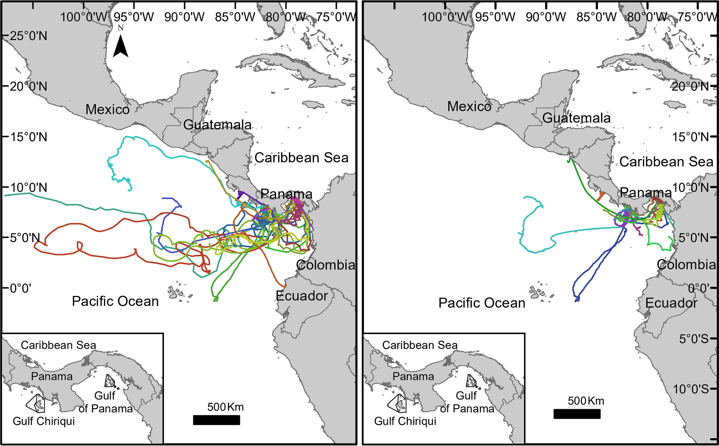 Migratory tracks of 30 Rhincodon typus tagged with satellite transmitters off the Pacific coast of Panama: complete trajectories of 30 individuals (left plot); removed or partially trimmed of 25 individuals (right plot). Inset with map of the Pacific coast of Panama showing the Rhincodon typus tagging areas around Coiba National Park (Gulf of Chiriquí) and the northeast Las Perlas Archipelago (Gulf of Panama).