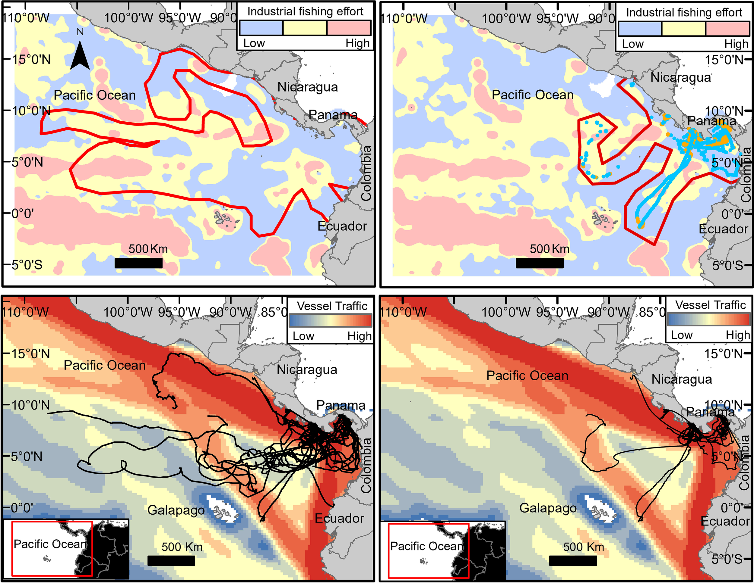 The location data also overlapped with regional marine vessel traffic. Long-range identification and tracking (LRIT) data were obtained from Pole Star Panama for all months in 2013 for the entire region. Pole Star is a leader company in maritime intelligence that monitors with satellite transmitters more than 34,000 ships worldwide. The impact of vessel traffic was estimated by creating a kernel density analysis weighted by vessel speed (speed reported by the Pole Star data) and identifying low-, medium-, and high-impact areas (based on kernel´s data quartiles of the combined effect of vessel density and traveling speed). Rhincodon typus locations that occurred inside a MPA were identified using the World Database on Protected Areas [administered by the United Nations Environment Program (UNEP) and the International Union for the Conservation of Nature (IUCN), managed by the UNEP World Conservation Monitoring Centre (UNEP-WCMC)]. All spatial analyses were performed using ArcGIS (v10.6).