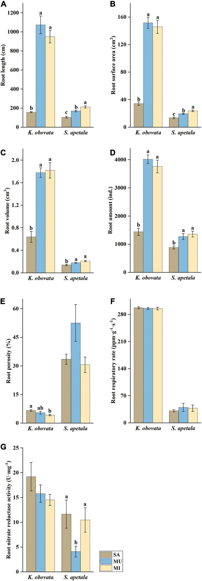 Correlation between parameters of root morphology and physiology in sediment types [sand (SA), mud (MU), and mixture of mud and sand by volumetric ratio of 1:1 (MI)]. Graphs panels (A–C) represent the correlation of parameters in K. obovata, and graphs panels (D–F) represent the correlation of parameters in S. apetala. *Indicates a significant difference (p < 0.05) among the sediment treatments.