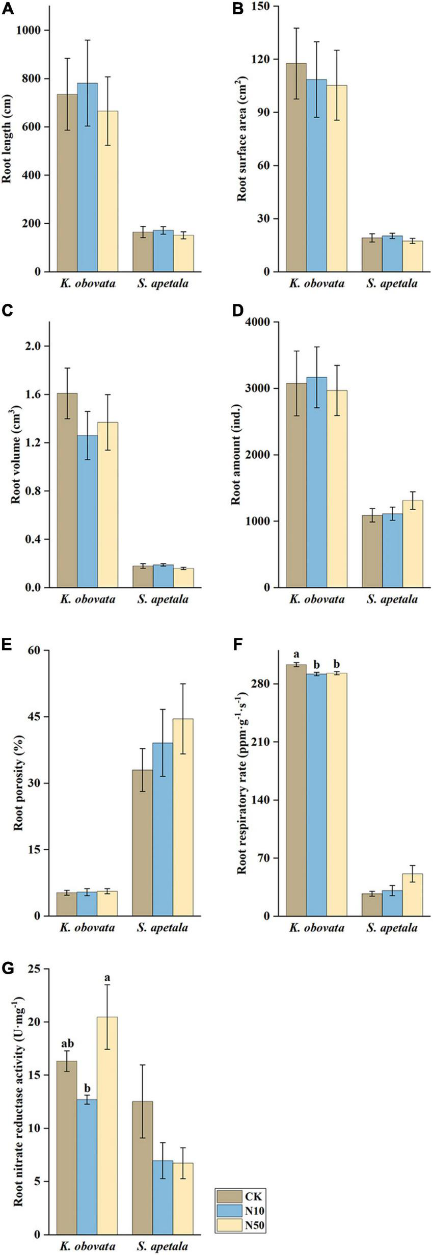 Apart from the patterns of different sediment treatments, the treatments of additional N input had no significant influence on either the morphological or physiological parameters of mangrove seedling roots for S. apetala. The same pattern of morphological parameters was also applied to the seedlings of K. obovata, while obviously higher root respiratory rate and root NR activity were detected from its seedlings in treatments of CK and N50, respectively (Figure 2 and Supplementary Table 1).