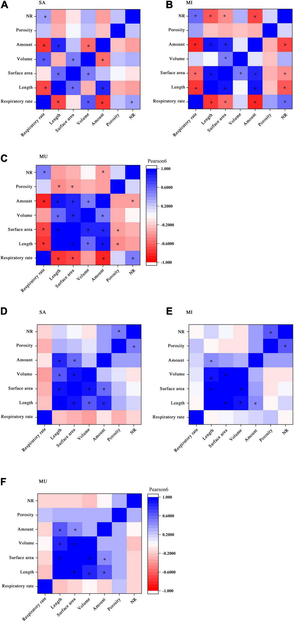 For S. apetala, root respiratory rate was not significantly correlated with other traits among sediment treatments. To morphological traits, root length was significantly positively correlated with root surface area, root volume, and amount of roots among sediment treatments. Root surface area had a significant positive correlation with root volume in the three sediment treatments. A significant positive correlation of root porosity with NR was observed in the SA and MI, while the amount of roots had a significant positive correlation with root surface area in SA and MU.