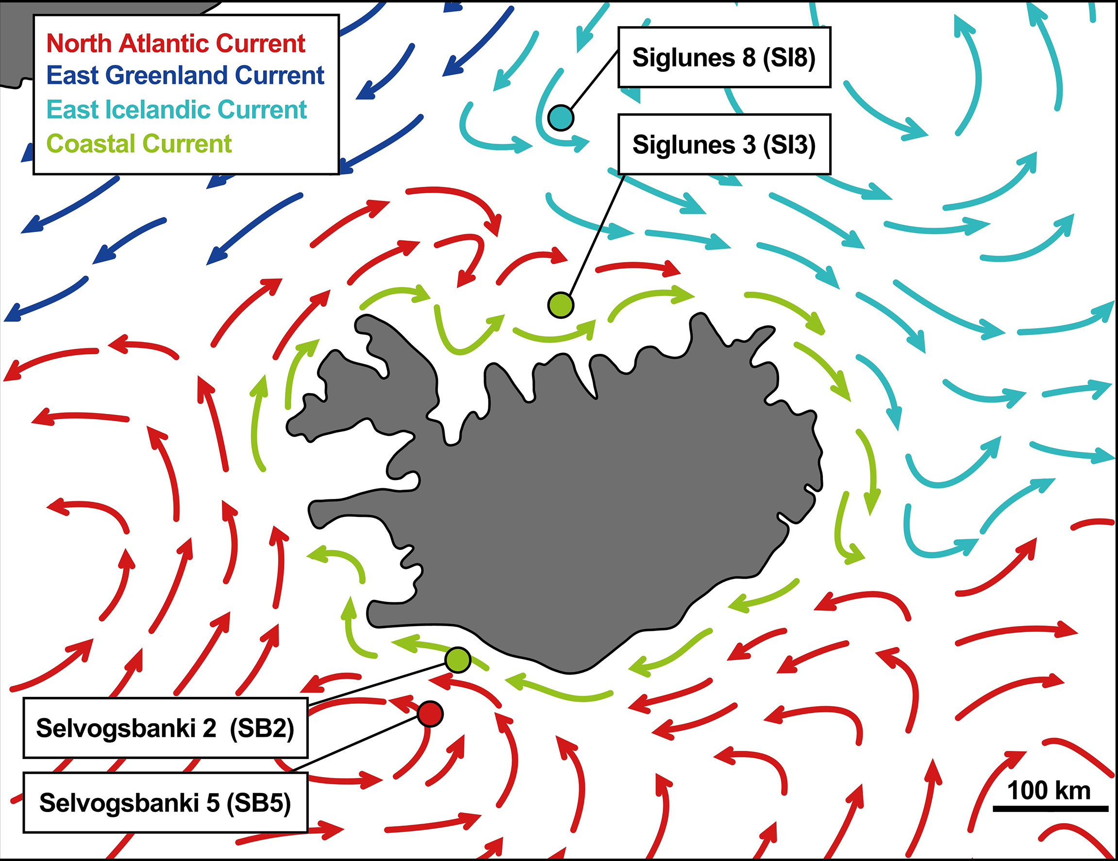 Map of the oceanic currents around Iceland adapted from Valdimarsson and Malmberg (1999) with sampling locations.