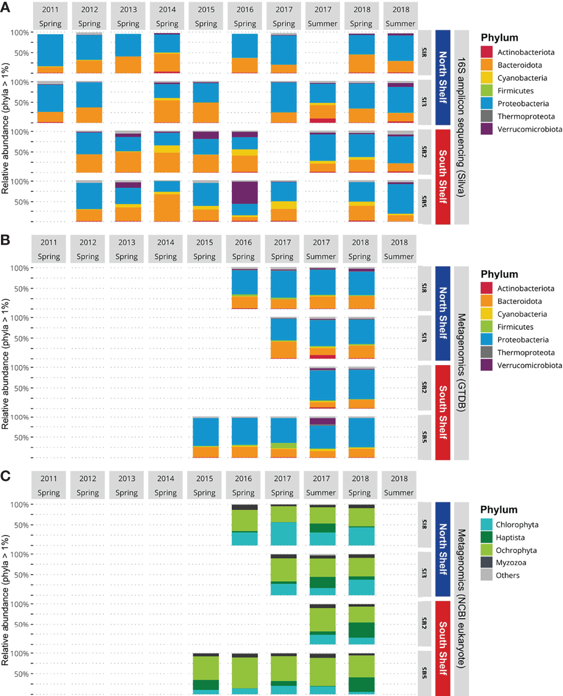 In the metagenomic taxonomic profiles for marine eukaryotes at the phylum level, Ochrophyta is the main component of the eukaryotic communities in the south while, Chlorophyta is the main component in samples from the more arctic stations on the North Shelf (Figure 2C). The relative proportions of Myzozoa range from 0.02% to 0.08% of the eukaryotic community. Haptophyta proportions are highly variable between samples. Haptophyta represent less than 5% of the community in spring 2016 but more than 30% of the community observed in samples from the South Shelf in spring 2018 (Figure 2C).