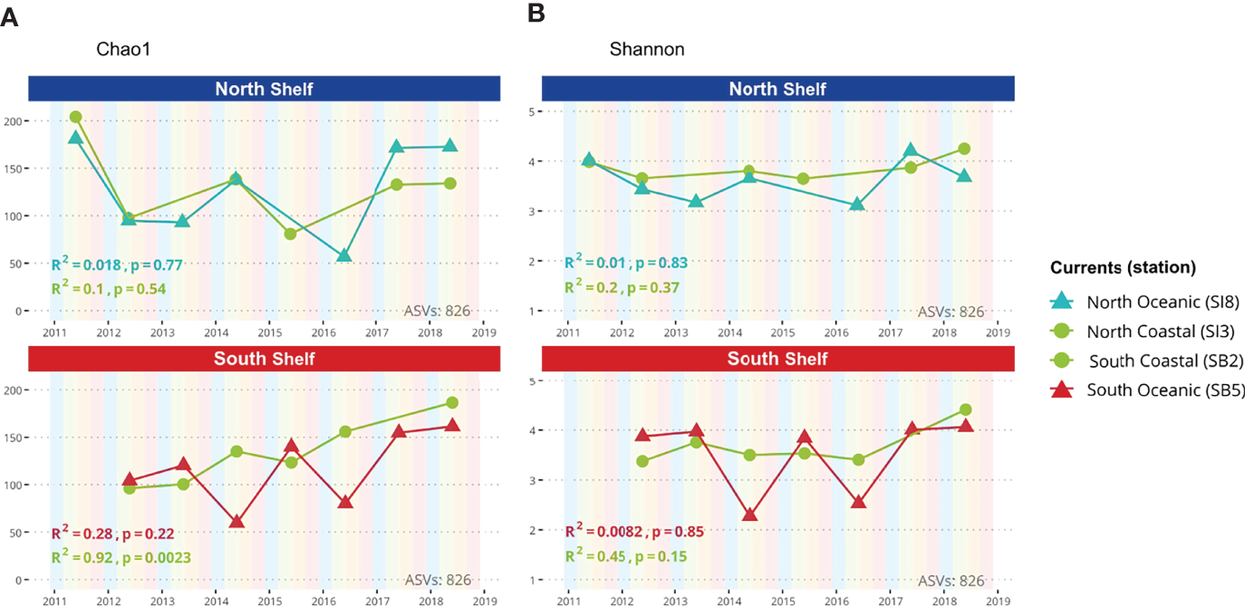 Alpha diversity. (A) Chao1 diversity index as a function of time for both coastal and oceanic stations in the North and South shelves of Iceland. (B) Shannon index as a function of time for both coastal and oceanic stations in the North and South shelves of Iceland.