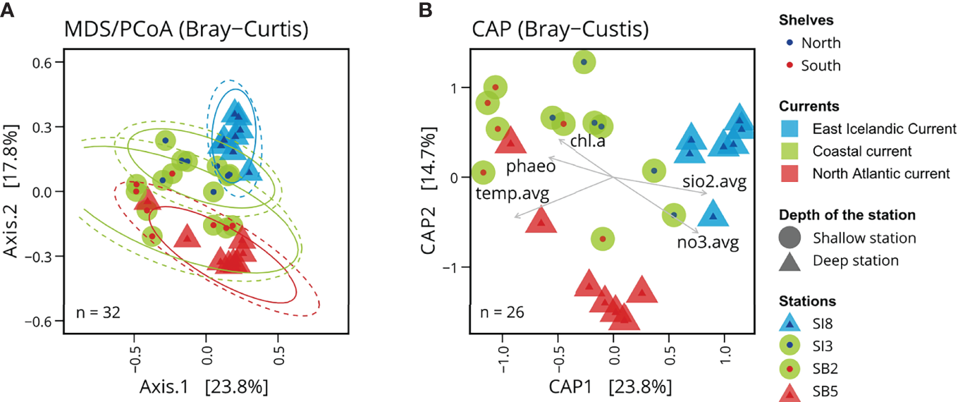 The PCoA based on Bray-Curtis dissimilarities (beta-diversity) shows a clustering pattern of the microbial surface communities in accordance with the different subregions, north and south of Iceland (Figure 4A), matching the different water masses. Clustering based on ASV profiles revealed distinct microbial communities, i.e. matching the Arctic Water influenced station SI8, the Atlantic-influenced station SB5 and the two shallower stations SI3 and SB2 with more variable water masses. The first principal coordinate (axis 1) of Bray-Curtis sample dissimilarities explained 23.8% of variation in archaeal and bacterial community composition across all samples while the second principal coordinate (axis 2) explained 17.8% of variations within these communities. It shows differences between the shallow and deep stations, as well as the North and South Shelves. These differences correspond to different water masses and currents, suggesting that the characteristics of these water masses are influencing factors. The canonical analysis of principal coordinates (Figure 4B) shows the environmental variables associated with these changes in community composition: the northern samples are associated with colder water temperature and higher concentrations in silicate and nitrate, while the southern shallow samples are associated with warmer water temperatures and higher levels of pigment (phaeopigments and chloropyll a).
