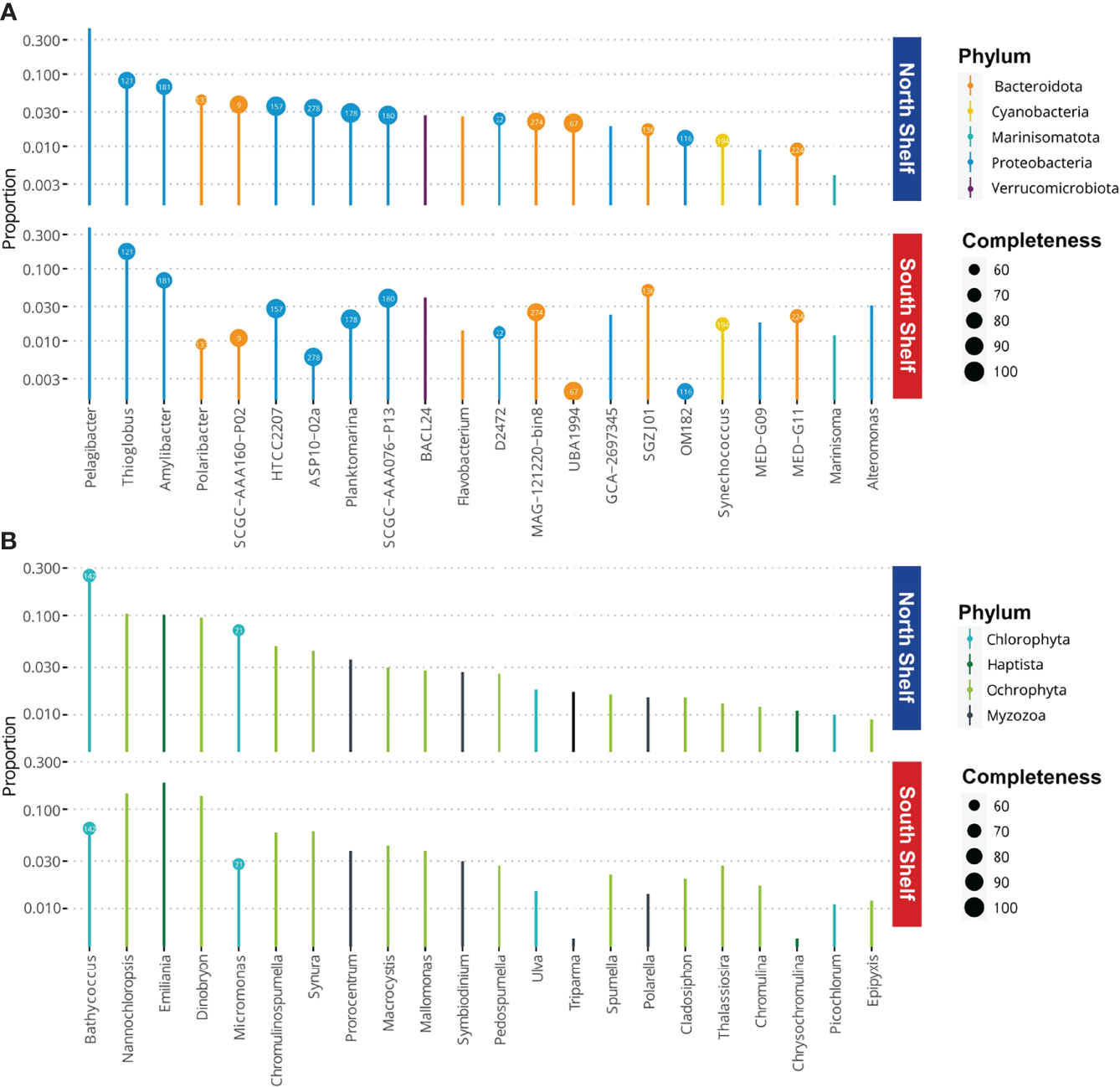 Microbial core taxa at phylum levels and the completeness (%) of the corresponding MAGs. (A) Proportions of bacterial core taxa of the microbial communities observed in samples from the north and south of Iceland. (B) Proportions of eukaryotic core taxa of the microbial communities observed in samples from the north and south of Iceland. Bubbles contain the ID number of the MAGs for the corresponding taxa (Supplementary Table S3).