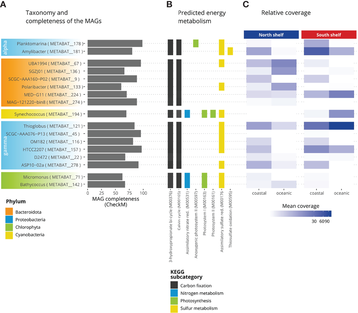 Metabolic potential of the core taxa of the microbial community in Icelandic marine waters. (A) Completeness of the MAGs. (B) Percentage of completeness of KEGG modules. (C) Relative coverage of the MAGs.