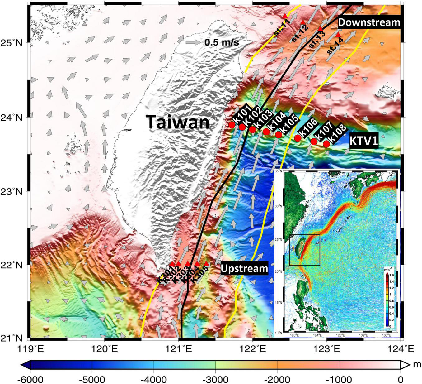 Sampling stations (K101–K108) along the KTV1 transect of the Kuroshio, east of Taiwan. The climatological current velocity (gray arrows) at a depth of 30 m was computed from the historical ADCP dataset available from Taiwan’s Ocean Data Bank. The bold black line indicates the maximum velocity axis at 15 m depth obtained from the surface drifter data. The solid yellow line indicates the 0.2 m s–1 isotach at 30 m depth obtained from the historical ADCP dataset (Jan et al., 2015). The path of the Kuroshio with velocity > 1 m s–1 is indicated by surface drifter trajectories and speeds (data available at http://www.coriolis.eu.org/Data-Products/Data-Delivery/Data-selection) in the lower right inset where the black dotted rectangle marks the map area.