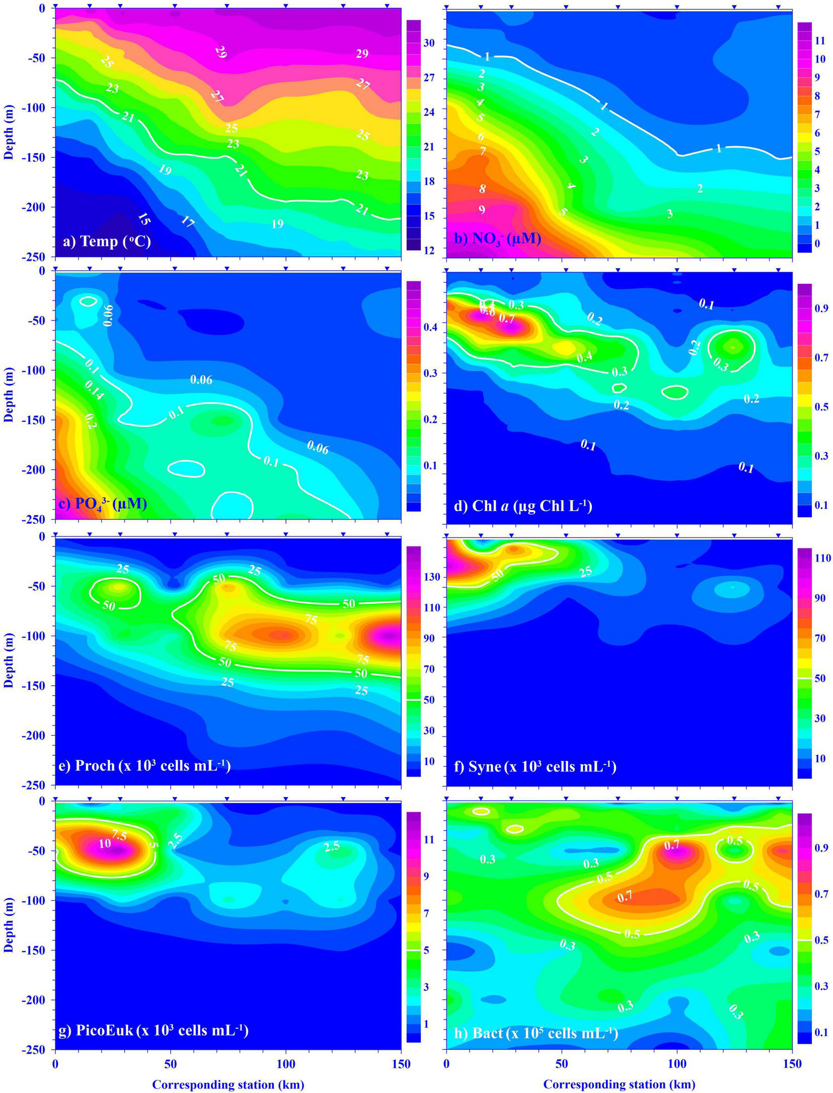 Typical depth profile contour plots of (a) temperature (Temp; °C), (b) nitrate (NO3–; μM), and (c) phosphate (PO43–; μM), (d) chlorophyll a (Chl a; μg Chl L–1), (e)Prochlorococcus (Proch; ×103 cells mL–1), (f)Synechococcus (Syne; ×103 cells mL–1), (g) picoeukaryotes (PicoEuk; ×103 cells mL–1), (h) heterotrophic bacteria (Bact; ×103 cells mL–1) within 250 m water depth along sampling stations in July 2014. Contour lines in white bold are guidelines including: temperature (21°C), nitrate (1 μM), phosphate (0.1 μM), Chl a (0.3 μg Chl L–1), Proch (50 × 103 cells mL–1), Syne (50 × 103 cells mL–1), PicoEuk (5 × 103 cells mL–1), and Bact (0.5 × 105 cells mL–1). The inverse triangles at the top of each panel indicate the locations of Stations K101–K108 along the KTV1 transect (Figure 1).