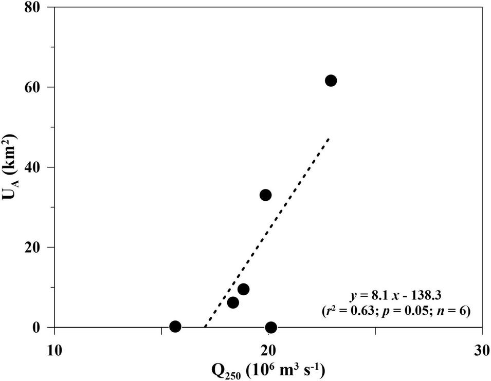 Relationship between the uplift area (UA; km2) and volume transport (Q250; SV; 106 m3 s–1) at different sampling periods. The slope and r2 of the linear regression (dashed lines) are shown and also applied to Figures 4–6.