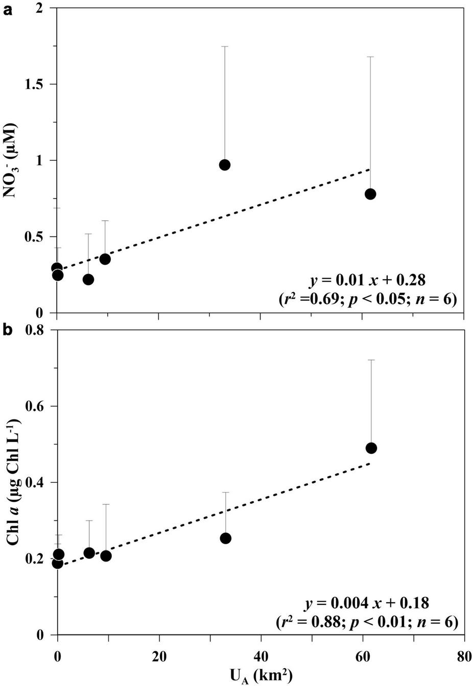Relationships between the uplift area (UA; km2) versus the mean depth-integrated values of (a) nitrate (NO3–; μM) and (b) chlorophyll a (Chl a; μg Chl L–1) over each sampling period. SD (vertical lines with caps) is also illustrated and applied to Figure 8.