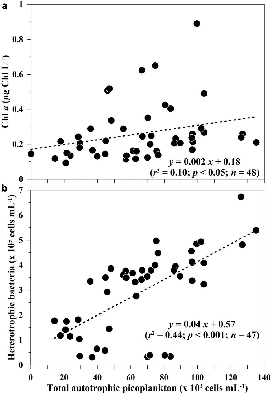 Relationships between the depth-integrated values of total autotrophic picoplankton abundance (×103 cells mL–1) versus (a) chlorophyll a value (Chl a; μg Chl L–1) and (b) heterotrophic bacteria abundance (×105 cells mL–1) for the upper 100 m depth of all sampling stations.