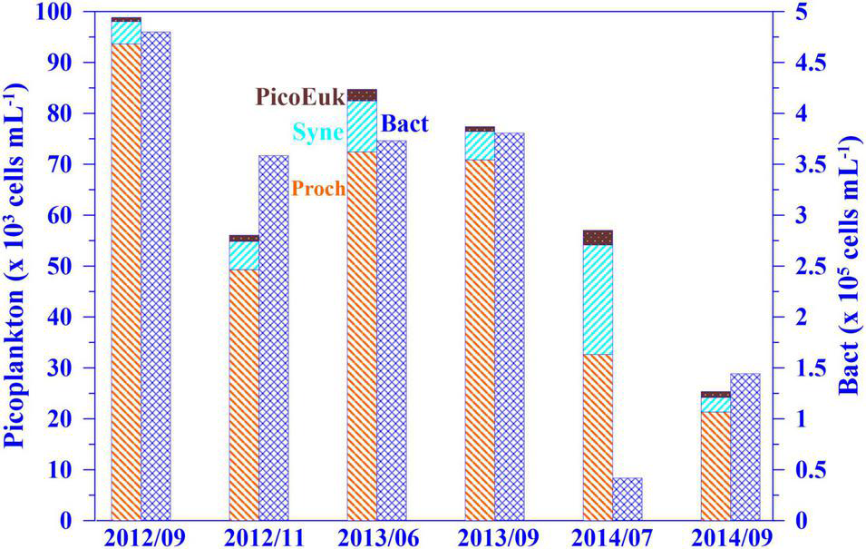 Variables include chlorophyll a (Chl a; μg L–1) concentration, abundances (×103 cells mL–1) of Prochlorococcus (Proch) Synechococcus (Syne), picoeukaryotes (PicoEuk), as well as heterotrophic bacteria (Bact; ×105 cells mL–1).