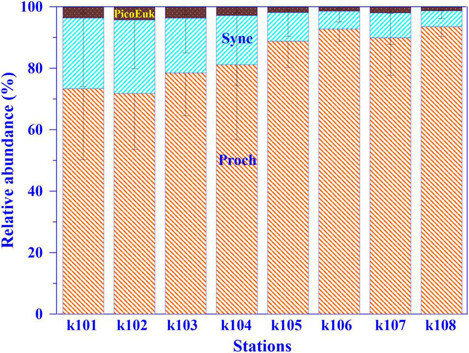 The relative abundances of different autotrophic picoplankton, including Prochlorococcus (Proch), Synechococcus (Syne), and picoeukaryotes (PicoEuk), to total autotropic picoplankton (Proch + Syne + PicoEuk) for the upper 100 m depth over each sampling station.